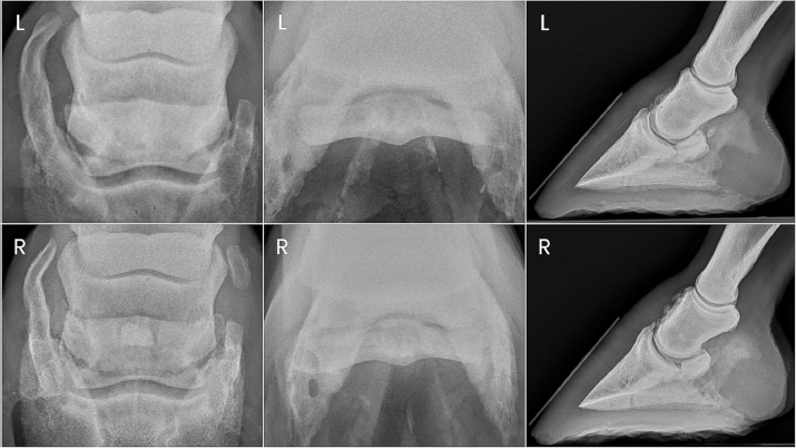 Fig. 2. Preoperative radiographs of the digits of horse 2. Horse 2 remained comfortable postoperatively with no appreciable lameness until approximately day 129, at which time a mild and inconsistent grade 4/5 RF lameness was noted. On day 136 post-PDN, the gelding was presented for student teaching of radiographic techniques. Radiographs were taken of both front digits, which revealed a parasagittal fracture of the right forelimb navicular bone and mild hyperextension of the right DIPJ (Fig. 4). Ultrasound revealed severe fiber pattern disruption of the DDF tendon suggestive of severe tendinopathy or rupture in the distal pastern region of both the right and left forelimbs. Humane euthanasia was elected due to the severity of the pathology and poor prognosis. Postmortem MRI was performed on both forelimbs revealing marked bilateral navicular bone degeneration with an obliquely oriented complete fracture of the lateral quarter of the navicular bone on the right forelimb, and bilateral severe DDF tendinopathy with almost complete rupture of the DDF tendon at the level of the navicular bone (Fig. 4). Additional findings of note in both forelimbs were significant navicular bursitis with probable bursal adhesions, enthesopathy of the flexor surface of the third phalanx at the DDF tendon insertion site, and impar, collateral sesamoidean ligament, and distal digital annular ligament desmopathy. DiscussionBoth cases described here report the occurrence of navicular bone fracture, DDF tendinopathy, and DIPJ subluxation after PDN in horses restricted to pasture turnout with no forced exercise. While these complications of PDN are well known, to the best of authors’ knowledge, they have not been reported specifically in horses not in work. PDN is typically performed to achieve soundness for some degree of athletic activity, creating a significant risk for catastrophic injury following surgery in a horse with structural unsoundness related to severe navicular bone degeneration and/or soft tissue injury. A search of the current literature identified only one case report of DDF tendon rupture and bilateral subluxation of the DIPJs after PDN; at the time of DDF tendon rupture, the horse was 8 weeks post PDN and it was not specified whether or not the horse had yet returned to work (Rose, 1977). The fact that both horses discussed here sustained such substantial complications of PDN while not in any kind of forced exercise program suggests that even the mechanical forces experienced from normal daily activity may predispose horses with significant pathology to catastrophic injury following PDN. This calls into question the rationale for performing PDN as a salvage procedure for horses with severe pathology. Candidates for PDN should be evaluated thoroughly to ensure appropriate case selection. In addition to navicular bone pathology, horses with navicular syndrome often have identifiable lesions of the DDF tendon and other soft tissue structures of the navicular apparatus. Specifically, there is a positive correlation between navicular bone abnormalities and concurrent DDF tendinopathy (Dyson et al., 2003, 2005; Blunden et al., 2006; Dyson and Murray, 2007; Dyson et al., 2011; Dyson, 2015). Severe, persistent lameness that improves following palmar digital anesthesia in the absence of radiographic evidence of navicular bone degeneration can be suggestive of soft tissue injury within the navicular apparatus including but not limited to the DDF tendon. MRI remains the gold standard for identifying musculoskeletal pathology of the distal limb (Dyson et al., 2003, 2005; Zubrod and Barrett, 2007; Blunden et al., 2009; Maher et al., 2011; Acutt et al., 2022). Unfortunately, the availability of MRI is sometimes limited, or MRI may not be financially feasible for some clients. Although technically challenging, the DDF tendon can be imaged with ultrasound as far distally as the proximal border of the navicular bone (Acutt et al., 2022); however, only 10%–28% of DDF tendinopathy lesions diagnosed with MRI were identified by ultrasound (Whitcomb, 2005, 2008; Acutt et al., 2022). Horses with core or linear lesions of the DDF tendon have been suggested to be poor candidates for PDN, as they have been shown to experience residual or early recurrent lameness postoperatively (Gutierrez-Nibeyro et al., 2015). DDF tendinopathy was a concern in both of the horses in the current report specifically due to the mineral opacities in the area of the DDF tendon noted on preoperative radiographs. Advanced imaging, such as MRI, was not obtained in either of these cases preoperatively due to a lack of availability and recognition that the PDN procedure was being performed to salvage the horses for pasture soundness only.