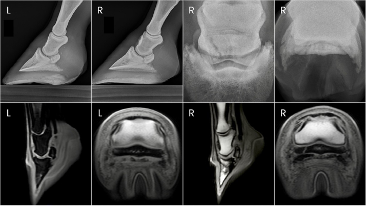 Fig. 3. Antemortem radiographs and postmortem MRI images of horse one showing bilateral navicular bone fractures, DIPJ hyperextension, and DDF tendon compromise.