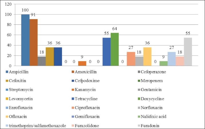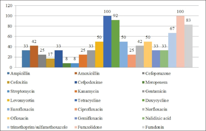 Fig. 1. Antibiotic resistance of E. coli isolates (%). Of the 28 Klebsiella strains examined, 86% (24 strains) of the microorganisms were resistant to tetracycline and doxycycline, 75% (21 strains) to amoxicillin, 68% (19 strains) to ampicillin, to cefpodoxime 61% (17 strains), to ofloxacin 54% (15 strains), to cefoxitin 50% (14 strains), to norfloxacin and trimethoprim 40% each (11 strains), to nalidixic acid cefoperazone enrofloxacin and ciprofloxacin 29% (eight strains each), to levomycetin and furadonine 25% (seven strains each) of microorganisms, to kanamycin 21% (six strains), to gentamicin 18% (five strains), to meropenem, gemifloxacin and furazolidone, 14% each (four strains), and the lowest number of organisms were resistant to streptomycin, 11% (three strains) (Fig. 2). Antibiotic resistance testing of 10 Citrobacter isolates resulted in all microorganisms being 90% resistant to tetracycline, amoxicillin, doxycycline, and nalidixic acid was resistant to 70% of the microorganisms, ampicillin, enrofloxacin Ofloxacin trimethoprim 60% of strains, norfloxacin, furazolidone 50%, cefoperazone, cefoxitin, ciprofloxacin, gemifloxacin, and furodonin 40% each, cefpodoxime and gentamicin 30%, meropenem, kanamycin and levomycetine 20% of organisms. No streptomycin-resistant strains were identified (Fig. 3). Of the 11 Enterobacter strains isolated, the microorganisms demonstrated 100% resistance to ampicillin, 91% to amoxicillin, 64% to doxycycline, 55% to tetracycline, and furadonine, 36% for cefoxitin, cefpodoxime, ofloxacin, 27% for ciprofloxacin and trimethoprim, 18% for cefoperazone, norfloxacin, and furazolidone, and 9% for kanamycin and nalidixic acid. Meropenem, streptomycin, gentamicin, levomycetin, enrofloxacin, and gemifloxacin were not identified as resistant to the isolates of Enterobacteriaceae (Fig. 4). A study of 12 microorganisms of the genus Proteus for antibiotic resistance demonstrated that 100% of the isolates were resistant to tetracycline and furazolidone; 92% of isolates were resistant to doxycycline, 83% of microorganisms were resistant to furadonine, 67% of isolates were resistant to trimethoprim, 50% of isolates were resistant to levomycetin, enrofloxacin, and ofloxacin, 42% of microorganisms were resistant to amoxicillin and norfloxacin, to ampicillin, cefpodoxime, gentamicin, gemifloxacin, and nalidixic acid 33%, to cefoperazone, kanamycin, enrofloxacin 25%, 17% were resistant to cefoxitin. The strains demonstrated the least resistance (8%) to meropenem and streptomycin (Fig. 5). The final stage of the work was to perform research to determine the resistance genes of the organisms. The results of these studies, using the polymerase chain reaction technique, from 149 samples of E. coli DNA (deoxyribonucleic acid), 46 samples were obtained that have genes encoding resistance to beta-lactase antibiotics (BlaTEM—26, OXA—20), aminoglycosides—62 (StrA—29, StrB—31, aadB—2), tetracyclines—44 (tetA—32 and tetB—12), sulfonamides—15 (SUL1—9, SUL3—6), fluoroquinolones—3 (qepA—2, qnr—1).