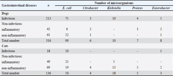 Table 2. Bacterial culture isolates obtained from animals with gastrointestinal diseases.