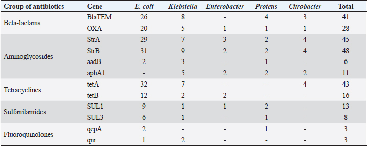 Fig. 5. Antibiotic resistance of Proteus isolates (%). Table 3. Resistance genes of microorganisms.
