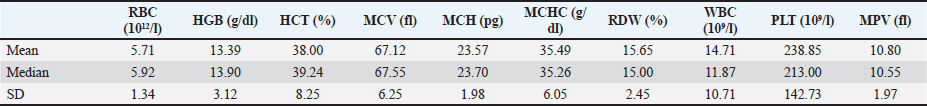 AbstractBackground: Canine lymphoma is the most common hematopoietic cancer in dogs. Numerous studies have evaluated the prognostic value of hematological abnormalities and ratios in both humans and dogs with lymphoma. Aim: To compare hematological parameters and complete blood count ratios between a population of dogs affected by lymphoma and healthy dogs to identify potential prognostic markers for lymphoma. Methods: This retrospective case-control study compares hematological parameters and complete blood count ratios between a population of 114 dogs affected by multicentric large B-cell lymphoma (LBCL) and 60 healthy dogs. Results: The study found several statistically significant differences between the hematological indices of LBCL dogs and healthy dogs, but no correlation between these parameters and the survival times of 78 dogs treated with chemotherapy Madison Wisconsin protocol. In addition, hematological alterations were evaluated such as anemia, leukocytosis, and thrombocytopenia. Conclusion: Hematological ratios have been suggested as potential prognostic markers for canine LBCL but their real prognostic value remains controversial and requires future investigation. Keywords: Dogs, Lymphoma, CBC, Indices, Ratios. IntroductionCanine lymphoma is the most prevalent hematopoietic malignancy in dogs. This term encompasses a group of heterogeneous diseases that differ in clinical presentation, immunophenotype, and prognosis (Valli et al., 2013; Zandvliet, 2016; Antognoni et al., 2021; Magni et al., 2023). Canine Lymphoma is a correspondent to non-Hodgkin Lymphoma in humans. Large B-cell lymphoma (LBCL) is the most frequent immunophenotype of multicentric lymphoma in dogs. Typically, lymphoma is diagnosed in middle-aged or dogs older than 10 years. Although no significant gender predisposition has been demonstrated, spayed females appear to have an increased risk (Zandvliet, 2016). The most widely used therapy for canine lymphoma consists of a multidrug combination (CHOP-based protocol) of cyclophosphamide, doxorubicin, vincristine, prednisone, and l-asparaginase without maintenance further therapy. The neoplasm is extremely aggressive, with a median survival time under treatment of approximately 8–10 months in dogs with LBCL (Bienzle and Vernau, 2011; Valli et al., 2013; Zandvliet, 2016). Many prognostic factors have been considered significant for LBCL, including clinical symptoms, stage, histological aspects, grade, proliferation markers, and response to treatment (Zandvliet, 2016; Davies et al., 2018). Given the aggressive behavior of LBCL, prognostic markers that allow monitoring the course of the disease in an easy, repeatable, and inexpensive way, are of critical importance. Many studies have focused on hematological parameters as potential prognostic markers. The hematologic examination is a minimally invasive procedure available to all veterinary clinicians, and it is routinely executed before chemotherapy administration. Several hematological parameters both in human and veterinary medicine have been proposed as prognostic markers for many different diseases, including vascular (Balta et al., 2016), degenerative (Wan et al., 2020), and inflammatory diseases (Neumann, 2021), as well as different types of tumors, such as soft tissue sarcoma (Macfarlane et al., 2016), laryngeal carcinoma (Yılmaz et al., 2018), acute myeloid leukemia (Zhang et al., 2021), and lymphomas (Henriques et al., 2021), and others. The possibility to use neutrophils/lymphocytes ratio (NLR) as an independent prognostic factor has been investigated in human patients with LBCL. To date, a high NLR value has been found to be associated with poor overall survival and poor progression-free survival. At the time of diagnosis, an NLR cut-off value of 3 has been reported in one study (Wang et al., 2017), and 3.5 in another (Porrata et al., 2010). This association between a high NLR and poor prognosis may be related to the production of inflammation mediators, resulting in immunosuppression and a reduction in the patient’s immune efficacy. In addition, a high platelets/lymphocytes ratio (PLR) appears to be correlated with a worse clinical condition of the patient and a poor prognosis in human LBCL, as reported by a 2019 meta-analysis study (Chen et al., 2019). In veterinary medicine, the predictive value of platelets/neutrophils ratio (PNR), NLR, and the level of anemia as prognostic factors in dogs with a diagnosis of LBCL has been suggested. Patients with a higher PNR above 0.032 showed earlier disease progression than others, while patients with NLR above 7.5 showed a higher mortality rate at 180 days (Henriques et al., 2021). On the other hand, several studies in both human and veterinary medicine have failed to demonstrate a statistically significant association between NLR and overall survival or progression-free survival (Mutz et al., 2015; Azuma et al., 2019). In humans, multiple studies have identified higher red blood cell (RBC) distribution width (RDW) as a negative prognostic factor in patients with LBCL (Zhou et al., 2017; Ai et al., 2018; Hasan and Elmeshhedany, 2021). In dogs, the prognostic value of this index has been investigated for a few diseases (Guglielmini et al., 2013, 2021, 2022; Garcia-Arce et al., 2022; Miglio et al., 2023) and only one study considered LBCL (Martinez et al., 2019). Furthermore, to date, the red blood cell distribution width to total serum calcium ratio (RDW/Ca) has been investigated and suggested as a ratio of prognostic relevance only in patients with acute pancreatitis, in both humans (Gravito-Soares et al., 2018; Han et al., 2021) and canine species (Guglielmini et al., 2022). However, the prognostic value of these hematological ratios in canine LBCL remains controversial and under investigated. Most of the existing studies conducted on this topic lack a control group of healthy patients for comparison. The main objective of the study is to assess the role o