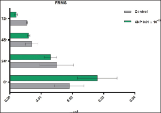 Turbidimetric analysisRegarding the lag time, significant reduction (p < 0.05) was observed in CNP-treated sperms when compared to those of control-0 (3.11 ± 0.26 and 6.46 ± 1.48, respectively), 24 (3.86 ± 0.56 and 4.92 ± 0.75, respectively), 48 (7.35±0.68 and 11.74 ± 1.95, respectively), and 72 hours (7.95±1.06 and 16.66 ± 0.79, respectively). However, values of control were decreased at a time of 0 hour but increased at times of 48 and 72 hours; while in CNP 0.01 ´ 10-13 group, values of 24, 48, and 72 hours were elevated significantly when compared to 0 hour (Fig. 4). Although, the percentages of motility index in CNP-treated sperms and control groups varied insignificantly (p > 0.05) at 0 hour (0.222 ± 0.034 and 0.247 ± 0.069, respectively); there was a significant reduction (p < 0.05) at 24 (0.037 ± 0.003 and 0.072 ± 0.005, respectively), 48 (0.012 ± 0.002 and 0.036 ± 0.0132, respectively), and 72 hour (0.0089 ± 0.0001 and 0.016 ± 0.0011, respectively). In both CNP-treated sperms and control groups, there were significant decreases (p < 0.05) in values of motility index at 24, 48, and 72 hours when compared to 0h (Fig. 5). The velocity of CNP-treated sperms was increased significantly (p < 0.05) when compared to control at all cooling intervals; 0 (0.399 ± 0.048 and 0.208 ± 0.098, respectively), 24 (1.286 ± 0.112 and 0.954 ± 0.143, respectively), 48 (0.89 ± 0.075 and 0.53 ± 0.016, respectively), and 72 hours (0.77 ± 0.031 and 0.324 ± 0.073, respectively). However, values of both CNP-treated sperms and control groups were increased significantly at 24, 48, and 72 hours when compared to 0h (Fig. 6). Although, FRMS was elevated significantly (p < 0.05) in CNP-treated sperms at the time of 0 hour (0.028 ± 0.0063) when compared to control (0.019 ± 0.0047), significant decreases (p < 0.05) were reported at 24 (0.013 ± 0.002), 48 (0.006 ± 0.0004), and 72 hour (0.002± 0.0005) when compared to control (0.015 ± 0.0054, 0.007 ± 0.0002, and 0.0055± 0.00014, respectively). However, values of both CNP 0.01´10-13 and control groups were reduced significantly at 24, 48, and 72 hours when compared to 0h (Fig. 7).