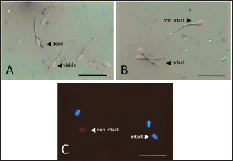 Fig. 3. Photograph of sperm quality parameter. Sperm viability (A), sperm membrane integrity (B), and sperm DNA integrity (C) (Bar=50 μm). Experiment 2Table 2 shows the results of the fertility test using preserved epididymal sperm. There are three treatment groups based on sperm source: no sperm (control −), ejaculate sperm (control +), and immotile epididymal sperm preserved from D12. We found that epididymal sperm is preserved until D12 can still able to activate and fertilize the matured oocyte. We notice that D12 sperm can fertilize matured oocytes by observing 2 PN formation at 31.37% ± 1.75%. On the other hand, D12 sperm can activate oocytes at 52.05% ± 7.15% as shown (accumulation number) by the presence of 1 and 2 PN formation. Moreover, we also found 45.38% ± 5.04% of oocytes which cannot be activated by D12 sperm as 0 PN observed. Furthermore, D12 sperm is comparatively lower when compared to the control (+), as we found more activated (52.05% ± 7.15% vs. 71.67% ± 4.41%; p < 0.05) and fertilized oocyte (31.37% ± 1.75% vs. 41.39% ± 4.74%: p < 0.05). Figure 4 depicts the formation of PN in oocytes following ICSI. Oocytes that did not develop PN (Fig. 4A) were classified as not activated due to activation failure. The oocytes that developed 1PN (Fig. 4B) and 2PN (Fig. 4C) were classified as activated. Only oocytes with 2PN, on the other hand, were considered fertilized. The finding could explain why preserved epididymal sperm has the same ability as ejaculate sperm in activated and fertilized oocytes. It should be noted that immotile sperm used is sperm that shows positive results on the HOST. Table 2. Oocyte development after ICSI.
