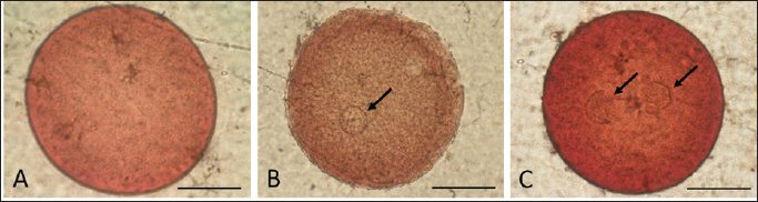 Fig. 4. Oocyte with no (A), one (B), and two (C) PN (shown by arrows) after sperm injection. (bar=50 μm). We used control (−) to test the effect of mechanical injection on oocyte activation in this study, and we found no formation of PN (Table 2). This suggests that in this study, sperm was the only factor that activated and fertilized matured oocytes. As a result, this demonstrates that ICSI without sperm cannot activate oocytes, as evidenced by the lack of PN development. DiscussionThe simple preservation of epididymal sperm using 0.9% NaCl at 5°C aims to maintain sperm viability by slowing down cell metabolism. Preservation, on the other hand, resulted in a decrease in sperm motility and viability as we discovered in the current study (Table 1). It can be seen that during the preservation process, the motility of epididymal sperm decreased markedly from the first day (D0) to the twelfth day (D12). Earlier studies also reported the same finding of sperm quality decline during preservation time in various animals and different methods in ram (Lone et al., 2011; Paul et al., 2018), in bull (Bertol et al., 2013; Rahimizadeh et al., 2021), in equine (Monteiro et al., 2013), in cat (Mardatillah et al., 2020), and in bucks (Abu et al., 2016) for example. The most plausible explanation for sperm quality decline during preservation is oxidative stress caused by reactive oxygen species (ROS) accumulation. During the preservation process, epididymal sperm continues to carry out metabolism processes to stay alive by carrying out oxidation processes resulting in ROS. As a result, the accumulated ROS causes lipid peroxidation (LPO), which damages the plasma membrane and, as a result, reduces sperm motility, sperm viability, and related sperm membrane function (Baumber et al., 2000; Garrido et al., 2004; Pujianto et al., 2021; Sedaghatizadeh et al., 2023). It is also stated that ROS is produced by the natural mechanism of cells. ROS is an oxidative agent categorized as oxygen-derived free radicals produced by living cells from oxygen metabolism (Sikka, 1996). A number of studies (Sikka, 1996; Ford, 2004; Agarwal et al., 2006; Maneesh and Jayalekshmi, 2006; Aitken et al., 2022) found that free radicals such as superoxide anion (O2-), hydrogen peroxide (H2O2), peroxyl radicals and hydroxyl radicals (OH-) are produced during ROS production and highly reactive. In addition, free radicals are also produced in the form of nitrid oxyd (NO-) and peroxynitrite anion (ONOO-), which appear to be important in reproduction and fertilization. The ROS product, hydrogen peroxide plays an essential role in reducing sperm quality (Pujianto et al., 2021; Sedaghatizadeh et al., 2023). Furthermore, hydrogen peroxide damages the sperm membranes. Damage to the sperm membrane can be explained by the fact that the sperm plasma membrane is composed of many chains of unsaturated fatty acids, making it susceptible to LPO influence by hydrogen peroxide. This phenomenon was confirmed in our result (Table 1), which shows the decrease in motility, percentage of sperm viability, sperm with intact membrane, acrosome, and DNA as the days of preservation passed-presumably, more hydrogen peroxide which leads to LPO which disrupt cell membrane function. The continuous production of ROS resulted in a significant (p < 0.05) decrease in sperm qualities. According to previous research, adding or supplementing antioxidants during sperm preservation may be beneficial in protecting sperm from ROS, as reported in earlier studies (Agarwal et al., 2006; Aitken and Drevet, 2020; ChaithraShree et al., 2020). In addition, it is stated that high concentrations of hydrogen peroxide cause significant DNA damage to sperm (Kumar and Muralidhara, 2007). It is explained that peroxidation damages the DNA base in the guanine base. Our results (Table 1) show a significant (p < 0.05) decrease in sperm with intact DNA during preservation, as confirmed by Hoescht and PI dye observations. The number of sperms with DNA damage increased with the number of days of preservation, indicating that more free radicals were produced. If the DNA-damaged sperm is used for fertilization, it will result in failure of fertilization of the oocytes. Aside from the negative impact, ROS in controlled amounts will affect sperm hypermotility, capacitation, and acrosomal reactions in sperm (De Lamirande et al., 1997; Henkel et al., 2018; Mannucci et al., 2022). On the other hand, ROS under controlled conditions plays a role in ovulation and fertilization in female animals, implying that ROS is also important in the reproductive process (Fujii et al., 2005). Cells naturally counteract the harmful effects of ROS production by secreting antioxidants. Antioxidants, such as superoxide dismutase and glutathione peroxidase (GPx) are secreted on a regular basis in the epididymis epithelium in living animals (Potts et al., 1999; Luberda, 2005). These antioxidants would mitigate the negative effects of ROS on the cell. The goal of simple preservation of epididymal sperm is to keep it viable for a set period of time so that it can be used for biological processes, specifically fertilization. Fertilization occurs naturally when mature oocytes are by sperms, followed by a cascade process such as PN formation and later embryo development. As shown in Table 2, preserved epididymal sperms from D12 that are immotile still able to activate and fertilize mature oocytes after ICSI by the presence and development of PN. However, when compared to control (+), ICSI with ejaculated sperm produces significantly lower results (p < 0.05). It has been reported that failed fertilization after ICSI is mainly attributed to the sperm’s inability to induce oocyte activation, and Phospholipase C zeta (PLCζ) is one of the factors for the induction of oocyte activation (Aghajanpour et al., 2011), during fertilization process (Nomikos, 2015; Machaty, 2016). The oocyte activation is driven by intracellular calcium 