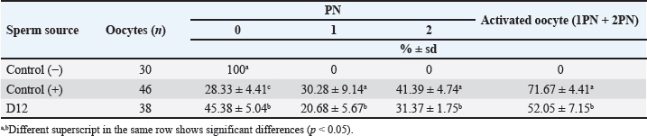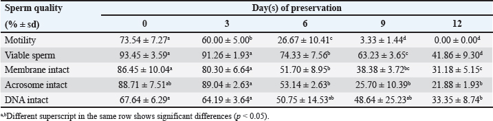 Data Analysis The preservation and microinjection of ram epididymal sperm were repeated three times as a replicate. In this study, statistical analysis was done by analysis of variance, followed by the Duncan test as post hoc analysis. The threshold for significant differences was set at p < 0.05, and all data were presented as mean ± sd. Ethical approval There were no treatments given to the animals in this study. We collected sheep epididymis and ovaries from a local abattoir that follows Indonesian regulations to avoid animal discomfort and pain, as outlined in government law number 18 on animal husbandry and health, which was issued in 2009. A veterinarian also supervises sample collection to ensure that it is suitable for use in the study. ResultsExperiment 1Table 1 shows the quality of epididymal sperm during preservation. It demonstrates that all quality parameters decreased significantly (p < 0.05) from D0 to D12 of preservation. The motility parameter showed a significant decrease (p < 0.05) from D0 to D9, with no motility (0%) observed at D12. Despite the lack of motility at D12, we still see viable (life) sperm, sperm with intact membrane, acrosome, and DNA at 41.86% ± 9.30%, 31.18% ± 5.15%, 21.88% ± 1.93%, and 33.35% ± 8.74%, respectively. Figure 3 shows that viable sperms have a pale and clear head (Fig. 3A). In the HOST result, sperm with intact membranes were characterized by a curved and/or swallow tail (Fig. 3B), whereas sperm with intact DNA emitted blue fluorescence under a microscope (Fig. 3C). We decided to use D12 as the source of preserved sperm for the fertility test in experiment 2 based on the results of experiment 1. The reason was that we discovered the lowest sperm motility in D12 when compared to another day of preservation.