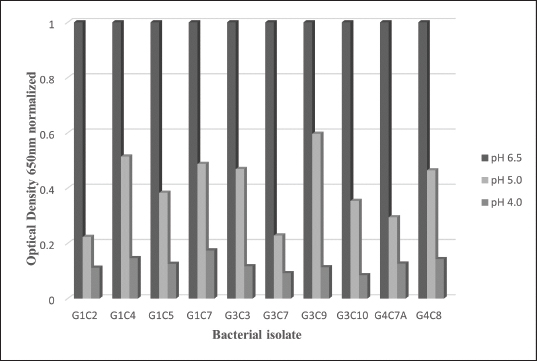 Fig. 2. Bar chart illustrating the tolerance of bacterial isolates to pH 5.0 and 4.0 expressed in OD values at 650 nm normalized with respect to growth at pH 6.5. (*) indicates significant differences.