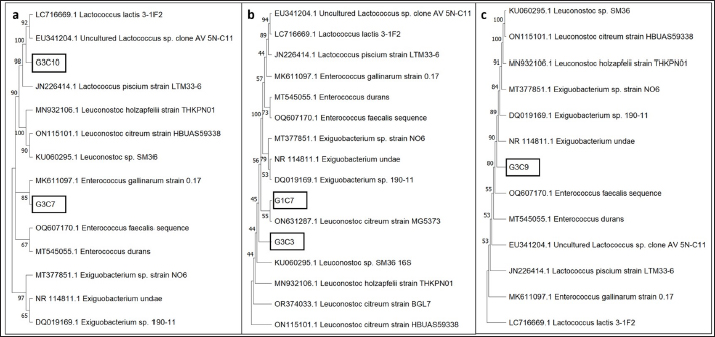 Fig. 5. Phylogenetic trees based on 16S rRNA gene sequences for 05 isolates enclosed in a black rectangle. A) Phylogenetic tree for isolates G3C10 and G3C7. B) Phylogenetic tree for isolates G1C7 and G3C3. C) Phylogenetic tree for isolate G3C9. Conversely, no bacteria with cellulase activity were documented in contrast to other investigations in guinea pigs, where 4% of bacteria exhibited cellulolytic activity (Serrano et al., 2020). Comparable cellulolytic activity has been observed in isolates from the intestinal tract of chickens (Nurliana et al., 2022). Within the context of probiotic attributes, one of the paramount considerations is the resilience of lactic acid bacteria to low pH conditions, with some strains demonstrating tolerance to exceedingly low pH values (pH 2.0). These bacteria exhibit resilience for a minimum of 2 hours, yet optimal growth is observed at pH levels proximate to neutrality (Jomehzadeh et al., 2020; Marchwińska and Gwiazdowska, 2022). Lactic acid bacteria isolated from guinea pig feces have similarly displayed tolerance to pH levels of 2.0 and 4.0 (Serrano et al., 2020). Consequently, the characteristics of the microorganisms elucidated in this investigation concur with these notable attributes. The antagonistic proficiency against pathogenic microorganisms stands as a pivotal criterion in the discerning selection of probiotics. This investigation substantiates the in vitro antagonistic efficacy against Salmonella sp., a precipitating factor in guinea pig mortality, thereby underscoring the potential of these probiotic strains to mitigate Salmonella sp. infections in guinea pig hosts (Ortiz, 2016; Serrano et al., 2020). Moreover, this antagonistic prowess extends to other pathogens, including Yersinia enterocolitica, Shigella flexneri, E. coli, and S. aureus, as documented in existing literature (Jomehzadeh et al., 2020; Ahmed et al., 2021). The hemolytic capacity assessment of the bacterial isolates serves a dual purpose: first, to categorically exclude strains with potential pathogenicity, aligning with the guidelines stipulated by the Food and Agriculture Organization (FAO) regarding the safety imperative for host organisms in the context of probiotic applications (FAO, 2016; Deidda et al., 2020). Second, the observed halos in this study signify a manifestation of alpha hemolysis on blood agar (Halder et al., 2017). Consistent with these findings, prior investigations have reported analogous hemolytic activity in lactic acid bacteria isolated from the gastrointestinal tracts of poultry and swine (Tuyarum et al., 2021; Makzum et al., 2023). The degradation of blood agar is posited to be instigated by hemolysin, an enzymatic agent capable of lysing host cells to facilitate the assimilation of ferrous compounds, particularly hemoglobin (Chen et al., 2018). It is pertinent to note that such hemolytic attributes are conventionally associated with a multitude of pathogenic microorganisms. The phenomenon of autoaggregation is closely linked to the development of biofilms, facilitating enhanced adhesion and colonization within the intestinal environment. Simultaneously, coaggregation serves as a mechanism to impede the adhesion of pathogenic microorganisms to the intestinal epithelium (Venkatasatyanarayana et al., 2017). The observed proficiency in aggregation among the selected isolates aligns with findings reported by Kousha et al. (2021), who assessed the probiotic potential of Lactobacillus strains. This concordance is further substantiated by a study involving Lactobacillus strains isolated from the intestinal tracts of poultry, wherein a majority exhibited autoaggregation ranging between 11% and 29% after a 2 hours evaluation period (Aziz et al., 2019). However, extant literature also documents instances of lactic acid bacteria, sourced from the digestive systems of poultry, as well as dairy and meat products, and some vegetables as fermented Torshi exhibiting higher percentages of autoaggregation and coaggregation against Salmonella sp. within a 2–4 hours assessment window (Reuben et al., 2019; Ahmed et al., 2021; Nemati et al., 2023). Molecular analyses afford heightened precision in the identification of microorganisms possessing optimal probiotic characteristics. The identification of L. citreum, characterized as Gram-positive cocci with negative catalase activity, aligns with reports highlighting its probiotic capacity to inhibit pathogenic microorganisms (Muthusamy et al., 2023; Ahn et al., 2023). Members of this genera also have been isolated from fermented Torshi showing a high acid and bile tolerance (Nemati et al., 2023). This alignment is consistent with the characteristics identified in the present study for isolates G1C7 and G3C3, both classified within the same taxonomic group. Enterococcus gallinarum, identified as Gram-positive cocci with negative catalase activity (Eshaghi et al., 2015), closely mirrors the characteristics of isolate G3C7. This bacterial group is recognized for its probiotic potential, attributed to the production of pathogen-inhibiting bacteriocins, thus conferring them the status of potential immunomodulatory probiotics (Román et al., 2015; Totewad & Gyananath, 2018). Exiguobacterium species, characterized by adaptability to diverse habitats, typically exhibit Gram-positive cocci morphology with catalase activity (Pandey, 2020). It is noteworthy that isolate G3C9, while assigned to this species, manifested an absence of catalase activity. Some members of the Exiguobacterium genus have been reported to harbor probiotic potential associated with nutrient absorption and the reduction of host mortality (Hadi et al., 2014; Cong et al., 2017). Finally, L. lactis, recognized as a Gram-positive cocci with negative catalase activity, holds the status of a probiotic organism (Jung et al., 2020). ConclusionThe five selected isolates manifest commendable attributes qualifying them as potential probiotics. These features encompass