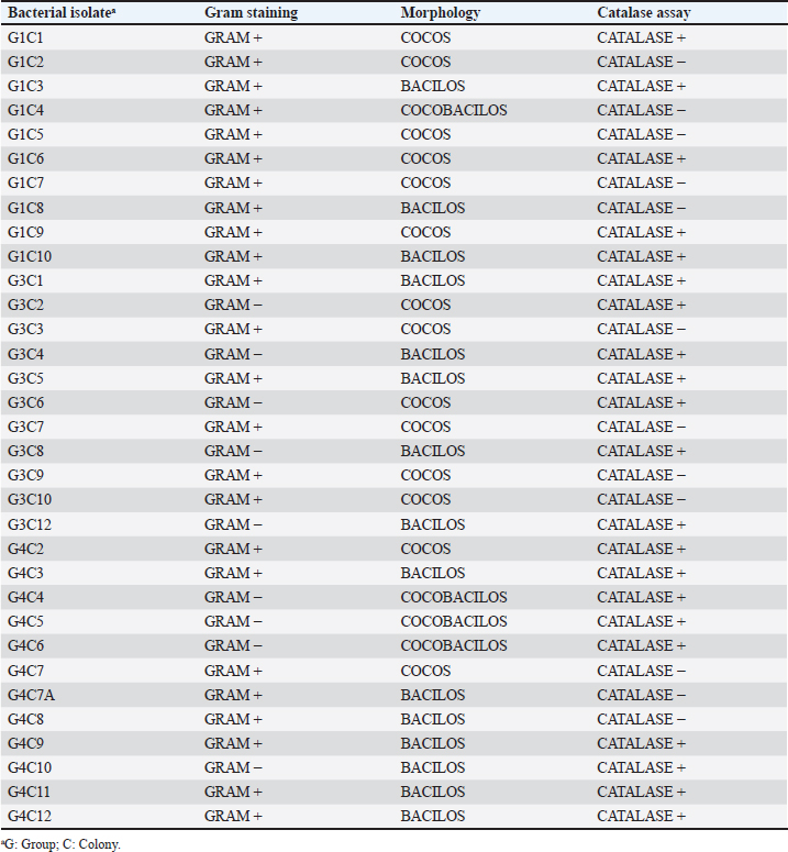 where AbsSalm and Absacid correspond to the absorbance at 650 nm of the Salmonella sp. and the lactic acid bacteria suspension at the beginning of the assay. Absmixture corresponds to the absorbance at 650 nm of the mixture of Salmonella sp. with lactic acid bacteria after 3 hours of the assay (Tuo et al., 2013). Bacterial molecular identification using 16S rRNA markerThe selected bacterial isolates from the previous tests were identified using molecular assays targeting a fragment of the 16S rRNA gene. Bacterial cultures were grown in MRS broth for 20 hours at 37°C under microaerophilic conditions, and their concentration was adjusted to 1.0 OD650. Bacteria were then centrifuged at 5,000 g for 10 minutes, and the resulting pellet was resuspended in saline solution (NaCl 0.9%). Genomic DNA (gDNA) was extracted using the GeneJet Genomic DNA Purification Kit (Thermo Scientific, USA), following the manufacturer’s recommended procedures (Ahmed et al., 2021). The quantity and purity of the obtained gDNA were verified using the spectrophotometer NanoDrop OneC (Thermo Scientific, USA). The bacterial genomic DNA’s 16S rRNA gene fragment was amplified using universal primers 27F: 5′ AGAGTTTGATCCTGGCTCAG 3′ and 1492R: 5′ GGTTACCTTGTTACGACTT 3′ at a concentration of 0.24 uM. The amplification was carried out through Polymerase Chain Reaction (PCR), employing 1U of Maximo Taq DNA polymerase (Geneon, Germany) and 0.2 mM dNTPs (Geneaid) in a 50 ul reaction volume. PCR was performed using a SimpliAmp thermocycler (Applied Biosystem, USA), initiating with an initial denaturation step at 95°C for 5 minutes. This was followed by 35 cycles of denaturation at 95°C for 30 seconds, annealing at 54°C for 40 seconds, and extension at 72°C for 1 minutes. An additional extension step at 72°C for 7 minutes concluded the cycling, followed by a final step at 4°C. The presence of PCR products was confirmed by electrophoresis on 1.5% agarose gels (Geneon, Germany) alongside a 100 bp DNA ladder (Geneaid Biotech, Taiwan). The PCR products were analyzed by 1.5 % agarose gel electrophoresis using a 1× buffer Tris-acetate-EDTA also used for the immersion of gel. Electrophoresis was run at 90V for 40 minutes in a Sub Cell GT horizontal electrophoresis chamber (BioRad, USA) connected to a PowerPac HC power supply (BioRad, USA). Gel visualization was performed using a GelDoc Go Imaging System (Biorad, USA). PCR products with a band size of approximately 1,500 bp were purified and sent for sequencing to Macrogen Inc., (Chile) using the ABI 3730XL DNA sequencer (Applied Biosystem, USA). Sequencing was carried out with primers targeting the V3-V4 region: 16S_V3-V4_IlluminaF (CCTACGGGGNGGCWGCAG) and 16S_V3-V4_IlluminaR (GACTACHVGGGTATCTAATCC). The generated sequences underwent analysis using the software program DNA Baser Sequence Assembler v5.21.0 (Heracle BioSoft, Romania) to confirm base assignments and sequence assembly. In addition, the Blastn free program (https://blast.ncbi.nlm.nih.gov/Blast.cgi?PROGRAM=blastn&BLAST_SPEC=GeoBlast&PAGE_TYPE=BlastSearch) was employed for the identification of genera and/or species corresponding to the obtained sequences. Phylogenetic relationships were inferred using the program MEGA 11 (Tamura et al., 2021). Phylogenetic trees were constructed using the maximum likelihood method with the Kimura 2-parameter model, incorporating a gamma distribution of substitution rates among sites and 1,000 bootstrap replicates. Sequences obtained in this study were used alongside 14 16S rRNA gene sequences retrieved from the NCBI GenBank database. Statistical analysisSoftware Microsoft Excel v.2312 (Microsoft Corporation, USA) was used to create tables and comparative graphs. Statistical tests were conducted using the program IBM SPSS Statistics v.26 (IBM Corp, USA). The non-parametric Kruskal-Wallis test (proteolytic activity, pH tolerance, autoaggregation, and coaggregation) for independent samples was employed with a 95% confidence interval. Multiple comparisons were conducted using the Dunn test with a Bonferroni correction for the level of significance. Ethical approvalNot needed because the animal manipulation was only for the collection of feces, the principles of animal welfare according to the World Organization for Animal Health (founded as OIE) were complied with and the animals were not sacrificed in this study. ResultsAnimals were randomly distributed in groups of 10 animals per pond to reduce stress due to high densities. The feces collected from each pond represented 03 replicates for the isolation bacteria that maximize the probabilities of obtaining acid lactic microorganisms with different morphologies for the following evaluations. A total of 33 pure bacterial isolates were obtained, distributed among Group G1 (10 isolates), Group G3 (11 isolates), and Group G4 (12 isolates), as detailed in Table 1. Gram staining characterization revealed that 73% exhibited a Gram-positive pattern, with 27% showing Gram-negative characteristics. Microscopic examination of all isolates identified cocci (42%), rods or bacilli (45%), and coccobacilli (13%). Notably, within the Gram-positive bacterial group, similar percentages were observed for both cocci and bacilli. Furthermore, catalase testing indicated that 64% of the isolates were catalase-positive, while 36% exhibited catalase-negative activity. From the initial characterization, ten acid lactic bacterial isolates were chosen for further evaluation, which were Gram-positive organisms, catalase negative, mesophilic, and rod or spherical shaped. The selected ones are: G1C2, G1C4, G1C5, G1C7, G3C3, G3C7, G3C9, G3C10, G4C7A, and G4C8. Isolates G1C8 and G4C7 were not considered due to their low or negligible growth in the conducted cultures. The potential for extracellular enzymatic activity of each selected microbial isolate was investigated using selective agar for protease, amylase, and cellulase activities. In all three cases, the 