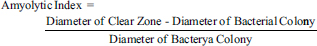Amylolytic activityThe assessment of amylolytic activity was conducted on nutrient agar plates (Hi-Media, India) supplemented with 1% soluble starch (Millipore, Germany). From bacterial cultures in MRS broth, 5 μl of each culture adjusted to a concentration of 1 OD 650 were inoculated in triplicate onto plates with nutrient agar and soluble starch. The plates were allowed to dry and then incubated at 37°C for 48 hours under microaerophilic conditions. Subsequently, 3 ml of a Lugol’s solution (Sigma-Aldrich, Germany) was added to each plate and allowed to stand for 5–10 minutes at room temperature. The appearance of a halo around the bacterial colony was considered an indicator of starch hydrolysis. Furthermore, the diameter of the halo and bacterial colony was measured to determine the amylolytic index using the following formula: