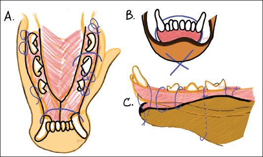 Fig. 2. Stitches made during the surgery. (A) The sutures from the dorsal view. (B) A single large horizontal mattress suture, passed through the chin and around the canine teeth, and was tied at the outer part of the skin. (C) The scheme of the sutures depicted from the lateral view of the mandibula sinister.