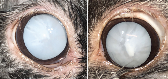 AbstractBackground: The occurrence of cataracts in rabbits is a common reason for consultation in veterinary ophthalmology. Case Description: A 6-year-old female Lop rabbit (Oryctolagus cuniculus) was referred with a 3-month history of bilateral cataracts. The owner noted that the rabbit was frequently bumping into obstacles. Physical examination was unremarkable. Routine hemogram and biochemistry panel were within usual values, and Encephalitozoon cuniculi were not detected by serology. A complete ophthalmological examination revealed bilateral hypermature cataracts causing total blindness. Bilateral tonometry showed normal intraocular pressures. Electroretinography (ERG) under general anesthesia revealed strong photoreceptor responses for each eye, and ocular ultrasound was normal except for bilateral hypermature cataracts. Following ERG, during the same anesthesia session, conventional phacoemulsification followed by acrylic intraocular lens (IOL; +58D) implantation was performed uneventfully in both eyes. Follow-up examinations were carried out for 1 year. Except for immediate post-operative bilateral corneal ulcers that were quickly cured with medical treatment, no other post-operative complications were observed. The 1-year follow-up examination revealed centered IOLs without posterior capsular opacity, enabling the observation of normal fundus in both eyes. The owner confirmed the rabbit had normal autonomy and moved with accuracy, as observed during follow-up visits and on videos provided by the owner. Conclusion: To the best of our knowledge, this is the first described case of successful bilateral phacoemulsification and bilateral intraocular lens implantation with prior electroretinographic evaluation of the retinal function in a pet rabbit with cataracts. Keywords: Cataract, Electroretinography, Intraocular lens, Phacoemulsification, Rabbit. IntroductionCataract, defined as an opacity of the lens or lens capsule is one of the most common causes of visual impairment and blindness in humans and animals (Glover and Constantinescu, 1997). Phacoemulsification cataract extraction with intraocular lens implantation is the standard surgical procedure in veterinary and human medicine. There is little information about the occurrence of spontaneous cataracts in rabbits (Williams, 2012; Gomes et al., 2018). The occurrence of cataracts in rabbits is low, a study of 1000 rabbits showed a low proportion of animals with cataracts with only 45 animals from that 1,000 having lens changes (Williams, 2021). The clinical case presented here describes the successful surgical management of bilateral cataracts in a healthy pet rabbit (Oryctolagus cuniculus) by bilateral phacoemulsification and bilateral intraocular lens implantation with prior electroretinographic evaluation of the retinal function. Case DetailsHistoryA 6-year-old female lop rabbit was referred to our hospital with a 3-month history of bilateral cataracts. The owner reported that the rabbit had frequently bumped into obstacles for the past 2 weeks, but no discomfort had been detected. The rabbit lived indoors with exits in the garden, the owners did not report any traumatic incident. The referring veterinarian had diagnosed bilateral mature cataracts and performed routine bloodwork and serum submission for indirect immunofluorescence for Encephalitozoon cuniculi. Results of routine hemogram and biochemistry were unremarkable and E. cuniculi was not detected by serology. Ophthalmic examinationA thorough ophthalmologic examination was performed. Palpebral, dazzle, direct, and indirect pupillary light reflexes were present in both eyes (oculus uterque OU). There was no pupil size asymmetry. The Schirmer tear test (Schirmer Tear Test, MSD Animal Health, Merck &Co., Inc., Rahway, NJ, USA) values were 13 mm/minute for the right eye (oculus dexter OD) and 11 mm/minute for the left eye (oculus sinister OG). Fluorescein stain (Fluoresceine 0.5% TVM, Dômes Pharma, Lempdes, France) was negative OU. Tonometry (Tonovet, Icare, Vantaa, Finland) revealed intraocular pressure (IOP) of 12 mm Hg OD and 11 mm Hg OS. Slit-lamp biomicroscopy examination (Hawk-eye, Dioptrix, Toulouse, France) revealed bilateral hypermature cataracts (Fig. 1), that prevented examination of the fundus OU by indirect ophthalmoscopy. No aqueous flare was apparent OU. On physical examination, the rabbit was in excellent overall condition. Electroretinography (ERG)Electroretinography under general anesthesia was scheduled to assess retinal function. Mydriasis was obtained with tropicamide eye drops (Mydriaticum 2 mg/0.4 ml, Thea Pharma, Clermont-Ferrand, France) (1 drop every 5 minutes for 20 minutes). The rabbit was premedicated with medetomidine (Dormilan, Axience, Barcelona, Spain) intramuscularly (0.07 mg/kg) and morphine hydrochloride (Morphine, CDM Lavoisier, Paris, France) subcutaneously (0.1 mg/kg). Afterward, general anesthesia was induced with ketamine (Anesketin, Dechra, AE Bladel, The Netherlands) intramuscularly (5 mg/kg) and intubation with a 2.0 endotracheal tube was performed. Anesthesia was maintained with 1.5% isoflurane (IsoFlo, Zoetis, Malakoff, France) delivered in oxygen. A 24-gauge catheter was set in the caudal auricular vein and sterile saline solution was delivered throughout the procedure. Electrodes were placed classically on each superior eyelid conjunctiva and subcutaneously at the base of each ear (Fig. 2). A reference electrode was placed subcutaneously on the dorsal neck. ERG (Visiosystem, Siem Bio-Medicale, Nîmes, France) was then performed: first an achromatic stimulation (1 Hz) in photopic conditions, followed by a blue stimulation (0.1 Hz) in scotopic conditions, another blue stimulation (0.1 Hz) after 8 minutes of dark adaptation, and then an achromatic flicker stimulation (30 Hz) in the photopic atmosphere. Bilateral recordings revealed strong photoreceptor responses for each eye (Fig. 3). Ocular ultrasonographyVitreoretinal ultrasonog