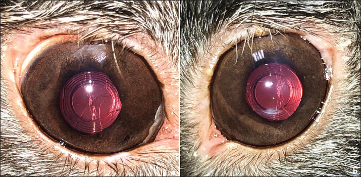 Fig. 6. Appearance of both eyes at 8 months post-operatively. Note well-centered intraocular lenses and presence of slight posterior capsular folds, in the right eye (a), in the left (b). Post-operative complications described in rabbits include post-operative ocular hypertension, post-operative inflammation with fibrinous reaction, particularly in young rabbits, and non-infected superficial corneal ulcers (Gomes et al., 2018). In our case, an ulcer of this type developed in both corneas one week after surgery. Conventional topical treatment allowed healing in each eye. The rabbit lens has a high potential for lens fiber re-growth and rabbits are known to produce posterior capsular opacities (PCO), more intensively in young animals (Wallentin et al., 2002; Gwon, 2008; Sandmeyer et al., 2011). In rabbits, PCO could be reduced by IOL implantation (Hazra et al., 2012; Ollerton et al., 2012; Sanchez et al., 2017). A prototype IOL with a size of 13 mm and a refractive power of +58 diopters has been shown to be of suitable size in rabbits and to achieve emmetropia in this species (Sanchez et al., 2017). Thanks to this latter study, an IOL designed for rabbits is now commercially available and was used for each eye in our case. Although it was formerly thought that a blind rabbit could apparently lead a normal life, it is now clear that for rabbits as for other animals, cataract surgery can greatly improve the rabbit's quality of life (Sanchez et al., 2018). It has been shown that rabbits can see both in front and behind them (Williams, 2013); therefore, a cataract, especially bilateral, greatly handicaps the animal in its movements. In our case, the owner confirmed that the rabbit had now regained autonomy and normal activity, and was moving with precision, with runs in the garden, as observed during follow-up visits and on videos provided by the owner. ConclusionTo the best of our knowledge, this is the first described case of successful bilateral phacoemulsification and bilateral intraocular lens implantation with prior electroretinographic evaluation of the retinal function in a pet rabbit with cataracts. AcknowledgmentNone. Conflict of interestThe authors declare no conflict of interest. FundingThis work received no specific grant or funding. Authors’ contributionsFG contributed the conception and design of the study. FG performed the examinations, surgery, and follow-up. MP, PB, and HC performed the anesthesia and its monitoring, and managed the anesthetic recovery and the return to feeding. FG wrote the manuscript. CC participated in the literature search and contributed to writing part of the discussion. All the authors approved the final draft of the manuscript. Data availabilityThe data supporting the findings of this study are available within the manuscript. Any other data are available from the corresponding author upon reasonable request. ReferencesAshton, N., Cook, C. and Clegg, F. 1976. Encephalitozoonosis (nosematosis) causing bilateral cataract in a rabbit. Br. J. Ophthalmol. 60, 618–631. Famiglietti, E.V. and Sharpe, S.J. 1995. Regional topography of rod and immunocytochemically characterized "blue" and "green" cone photoreceptors in rabbit retina. Vis. Neurosci. 12, 1151–1175. Felchle, L.M. and Sigler, R.L. 2002. Phacoemulsification for the management of Encephalitozoon cuniculi-induced phacoclastic uveitis in a rabbit. Vet. Ophthalmol. 5, 211–215. Geeraets, W.J., Harrel, W., Guerry, D., Ham, W.T. and Mueller, H.A. 1965. Aging anomalies and radiation effect of rabbit lens. Acta Ophthalmol. 43, 3–21. Gelatt, K.N. 1975. Congenital cataracts in a litter of rabbits. J. Am. Vet. Med. Assoc. 167, 598–599. Giordano, C., Weigt, A., Vercelli, A., Rondena, M., Grilli, G. and Giudice, C. 2005. Immunohistochemical identification of Encephalitozoon cuniculi in phacoclastic uveitis in four rabbits. Vet. Ophthalmol. 8, 271–275. Glover, T.D. and Constantinescu, G.M. 1997. Surgery for cataracts. Vet. Clin. North. Am. Small. Anim. Pract. 27, 1143–1173. Gomes, F.E., de Matos, R. and Ledbetter, E. 2018. Phacoemulsification of bilateral cataracts in two pet rabbits. Open. Vet. J. 8(2), 125–130. Gwon, A. 2008. The rabbit in cataract/IOL surgery. In: Animal Models in Eye Research 1st Edn. (Ed Tsonis, P.A.). Elsevier, London, UK, pp: 184–204. Hazra, S., Palui, H. and Vemuganti, G.K. 2012. Comparison of design of intraocular lens versus the material for PCO prevention. Int. J. Ophthalmol. 5, 59–63. Künzel, F., Gruber, A., Tichy, A., Edelhofer, R., Nell, B., Hassan, J., Leschnik, M., Thalhammer, J.G. and Joachim, A. 2008. Clinical symptoms and diagnosis of encephalitozoonosis in pet rabbits. Vet. Parasitol. 151, 115–124. Munger, R.J., Langevin, N. and Podval, J. 2002. Spontaneous cataracts in laboratory rabbits. Vet. Ophthalmol. 5, 177–181. Ollerton, A., Werner, L., Fuller, S.R., Kavoussi, S.C., McIntyre, J.S. and Mamalis, N. 2012. Evaluation of a new single-piece 4% water content hydrophobic acrylic intraocular lens in the rabbit model. J. Cataract Refract. Surg. 38, 1827–1832. Peng, X.W., Roshwalb, S., Cooper, T.K., Zimmerman, H. and Christensen, N.D. 2015. High incidence of spontaneous cataracts in aging laboratory rabbits of an inbred strain. Vet. Ophthalmol. 18, 186–190. Rampal, S., Kaur, R., Sethi, R., Singh, O. and Sood, N. 2008. Ofloxacin-associated retinopathy in rabbits: role of oxidative stress. Hum. Exp. Toxicol. 27, 409–415. Reichenbach, A. and Baar, U. 1985. Retinitis-pigmentosa-like tapetoretinal degeneration in a rabbit breed. Doc. Ophthalmol. 60, 71–78. Sanchez, R.F., Becker, R., Dawson, C., Escanilla, N. and Lam, R. 2017. Calculation of posterior chamber intraocular lens (IOL) size and dioptric power for use in pet rabbits undergoing phacoemulsification. Vet. Ophthalmol. 20, 242–249. Sanchez, R.F., Everson, R., Hedley, J., Dawson, C., Lam, R., Priestnall, S.L., Garcia de Carellan, A., de Miguel, C. and Seymour, C. 2018. Rabbits with naturally occ