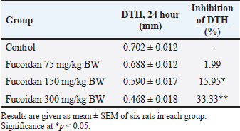 The neutrophil index of untreated blood samples is denoted by NIu, while the neutrophil index of treated blood samples is represented by NIt. Hemagglutinating antibody (HA) titerThe HA titer method was described by Sudjarwo et al (2018). There were four groups in the experimental models, each with six rats. On day 0, the rats in every group received an intraperitoneal injection of 0.1 ml of a suspension of 0.5×109 cells of SRBCs. In the treatment groups, fucoidan at varied doses (75, 150, and 300 mg/kg BW) was administered orally for seven days, whereas the control group of rats received 10 ml/kg BW of normal saline. On the seventh day, blood samples were taken from each rat’s heart to make the serum. Blood samples were centrifuged, and serum was extracted. The hemagglutination method was used to measure the antibody levels in 86 wells (12×8 flat-bottomed titer plates). A mixture of 25 µl serum and 25 µl normal saline was initially added to each well microtiter plate. The 25 µl diluted serum was then taken out of the first well and put into the second well to dilute the antibodies. Following the addition of 25 µl of 1×108 SRBC to each well, the microtiter plates were incubated for an hour at 37oC and then were checked for agglutination. DTH responseHamid et al (2020) method was used to calculate the DTH response. On day 0 of the immunization process involved injecting intraperitoneally 0.1 ml of a suspension of 0.5×109 cells of SRBC into the rats in each group. Rats were split into treatment and control groups. The control groups received 10 ml/kg BW of normal saline, while the treatment group received 75, 150, and 300 mg/kg BW of fucoidan orally for eight days. All of the rats received an SRBC challenge (0.5 x 109 cells) in the left hind foot pad on the seventh day of immunization. To control for nonspecific edema, the same volume of normal saline was injected into the right foot pad. The increase in footpad thickness was observed 24 hours following the challenge.