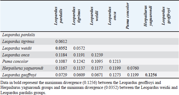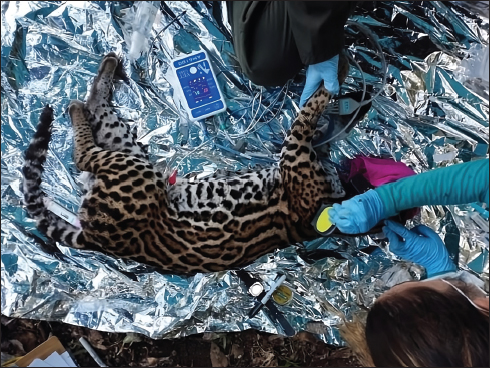 Fig. 1. Anesthetized ocelot during clinical evaluation, sample collection, and anesthetic monitoring. DNA extractionDNA was extracted from the blood sample. The entire volume contained in the EDTA microtainer was transferred to a 1.5 ml tube and incubated at 55°C for 20 min with 25 μl of proteinase K and 250 μl of BLU buffer. The extraction was continued according to the manufacturer’s instructions (HigherPurity™ Blood DNA Extraction Kit - Canvax Biotech). The sample was preserved in 30 μl of elution buffer. The sample was quantified in a NanoDrop™ 2000/2000c spectrophotometer (Thermo Fisher Scientific), where the quality and quantity of the sample were verified. Molecular identificationThe PCR for the molecular identification of the Leopardus pardalis specimen was performed by amplifying the cytochrome oxidase I (COI) gene fragment. Endpoint PCR was carried out in a final volume of 50 μl with 150 ng of DNA, 0.25 μl of Taq DNA polymerase, 0.5 μl of 10X buffer, 0.5 μl of dNTPs, and 0.5 μl 10 mM of each Chmf4 (TYT CWA CWA AYC AYA AAG AYA TCG G) and Chmr4 (ACY TCR GGR TGR CCR AAR AAT CA) oligonucleotide (Che et al., 2012). The reaction conditions were: 2 minutes at 94°C, 35 cycles of 30 seconds at 94°C, 30 seconds at 53°C, 48 seconds at 72°C, and a final extension for 1 minutes at 72°C. At the end of the reaction, a 959 bp COI gene fragment was obtained, verified in a 1.5% agarose gel, and visualized under a UV lamp (Labnet International, Inc.). Sequencing and phylogeny analysisThe PCR product was sent to a commercial company (Macrogen Inc., Korea) for sequencing using the Sanger method. The same company purified the product. For the phylogenetic analysis of the partial sequence of the COI gene, 17 sequences of felines representative of Colombia and South America were obtained. The sequences were aligned using the CLUSTAL W. Phylogenetic analysis was performed using the General Time Reversible substitution model with Gamma distribution (GTR+G), selected as the best substitution model based on the Akaike Information Criterion (AIC), and bootstrap values set to 1,000 replicates. Pairwise distance analyses were conducted using the Maximum Composite Likelihood model. All analysis were performed in MEGA v.11 software. Ethical approvalThis project was endorsed by the Bioethics Committee for Animal Research (CIBA) of Corporación Universitaria Remington (CUR) in its session on December 7, 2022, based on Minute 11 of the same year. In addition, the capture and collection of mammals in the selected localities is covered by the Framework permit for the Collection of Specimens of Wild Species of Biological Diversity for Non-Commercial Scientific Research Purposes granted by the National Environmental License Authority (ANLA, for its acronym in Spanish) with Resolution 00652 of April 13, 2020. ResultsIn the municipality of Buriticá, near Quebrada Chachafrutal (6°41’06.4”N 75°53’18.2”W), an adult female ocelot was captured (Leopardus pardalis). Its total measurement from head to the end of the tail was 108 cm; its height was 41 cm, with a body condition of 1, based on a scale from 1 to 5 (being 1: excessively thin, 2: underweight, 3: ideal weight, 4: overweight, and 5. Obese), a weight of 10.73 kg, with dry and opaque mucous membranes, and an estimated dehydration percentage of 4%–6%. The physical examination per system showed normality except for: i) the genitourinary system, where vaginal discharge was evident, and ii) in the integumentary system and annexes, a lesion was observed in nail no. 3 of the left anterior limb (LAL), and diffuse hypertrichosis was evidenced in the first two-thirds of the tail and at the level of the left ileum due to friction with the Havahart® trap. The peripheral blood smear analysis showed structures compatible with apicomplex protozoan hemoparasites and normal-shaped red blood cells and platelets in clusters. The hematology and blood chemistry examinations were performed in the Veterinary Diagnostic Unit of the CUR in Medellín. The values recorded were compared with reference values obtained from the only report of paraclinical parameters reported in the literature on ocelots in the wild (Widmer et al., 2016) and contrasted with the reference ranges established by the International Species Information System (ISIS, 2023) and Species 360 Global information serving conservation (Species360, 2023), which are elaborated from samples of captive ocelots (Table 1). The macroscopic appearance of the urine was turbid, yellow in color, pH 6.5, and with a density of 1020; the chemical examination determined a high presence of proteins (++++), blood in a small amount (+), ketone bodies in low amount 15 (+), positive for leukocytes (+++), and nitrites (++), negative for urobilinogen, glucose, and bilirubin. In the sediment, the following was observed: bacteria in moderate quantity, epithelial cells 4–6 per high power fields (HPF), tall cells 2–4 per HPF, mucus in scarce quantity (+), erythrocytes 1–3 per HPF, leukocytes countless. Additionally, eggs compatible with Capillaria spp. are observed; 54 eggs were counted in the entire plate (Fig. 2). In the coproparasitological analysis, four parasitic genera of the Nematoda class were found: Ancylostoma sp. (59.93 x 41.35 μm) (+++), Ascaridea (90.78 x 52.78 μm) (+), Toxocara cati (68.96 x 63.20 μm) (++), eggs of Dicrocoelium sp. (45.1 x 24.1 μm) (+++), and nematode larvae (290 μm) (+) (Fig. 3) were registered. The COI gene analysis as a method to identify animal species delivered a sequence of 663 base pairs registered in GenBank with access code OR345322 (Marin-Villa et al., 2023). The sequence of the present study OR345322 was aligned in a clade with two sequences from Leopardus pardalis, this clade presented good branch support greater than 86%. Furthermore, the pairwise distance between our sequence (OR345322) with respect to the sequences of Leopardus pardalis NC028315 and MW257208 was 0.