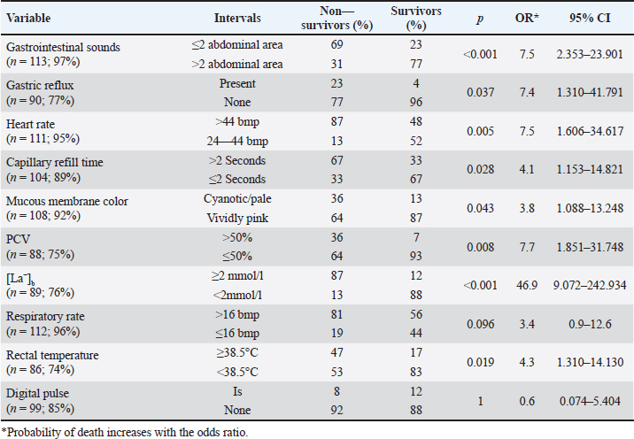 ABSTRACTBackground: Colic, a primary cause of illness and death in horses, necessitates the development of improved prognostic tools. Aim: The aim of this study was to investigate the prognostic significance of physiological and biochemical parameters in horses suffering from colic. Methods: A comprehensive clinical evaluation of 117 horses included assessment of heart rate, mucous membranes, capillary refill time, rectal temperature, respiratory rate, gut motility, reflux, and limb pulse strength. Results: Stomach reflux, absence of gut noises, and increased heart rate (mean increase of 12 bpm) strongly correlate with a poor prognosis. Prolonged capillary refill time (mean increase of 3 seconds), rectal temperature (over 38.5°C), elevated packed cell volume (mean increase of 4%), and blood lactate levels (mean increase of 5 mmol/l) underscore the significance of these markers. Notably, blood lactate (p < 0.001), gut noises (p < 0.05), and heart rate (p < 0.001) demonstrate the highest predictive significance based on statistical analysis. Conclusion: Future research should investigate the prognostic potential of additional parameters and assess the impact of recommended treatments on colic prognosis. This data-driven study emphasizes the critical role of early recognition and thorough assessment in colic cases, offering vital insights into improving equine healthcare and mitigating mortality rates. Keywords: Colic, Equine, Prognostic, Survival, Parameters. IntroductionThe abdominal pain symptoms known as colic are the leading cause of illness and death in horses. Consequently, they represent the most significant health concern in equines. Excessive consumption of carbohydrates, bloating, and changes in both food and environment may disrupt the delicate equilibrium of the microbiota in the hindgut. Dysbiosis may lead to physiological disruptions in the gastrointestinal system and impact the overall health of the horse, resulting in colic symptoms. There are several additional factors that can cause a horse to experience colic, such as dental issues, internal parasite infections, dehydration, prolonged use of nonsteroidal anti-inflammatory drugs and antibiotics, stress, torsion of the intestines, and stomach ulcers (Bland, 2016). Based on available records, it has been demonstrated that the mortality rate among horses affected by colic might vary within the range of 21% (Leblond et al., 2000) to 28% (Tinker et al., 1997; Egenvall et al., 2008). The assessment of patient signalment, anamnesis, and basic physical examination can provide valuable insights into the severity of colic conditions in equines (Cook and Hassel, 2014). The following are important components of the colic physical examination: heart rate, mucous membrane appearance and moisture, skin turgor and capillary refill time, as well as rectal temperature, respiratory rate, auscultation of gastrointestinal motility, rectal palpation, presence of gastric reflux, and digital pulsation (Cook and Hassel, 2014). Modifications in clinical indicators, including heightened heart rate, presence of cyanotic mucous membrane, prolonged capillary refill time, elevated rectal temperature, escalated breathing rate, and decreased gastrointestinal motility, indicate an unfavorable prognosis, and an increased risk of death in horses suffering from colic (Bland, 2016; Bihonegn and Bekele, 2018). When making treatment decisions and forecasting illness prognosis, it is advisable to consider supplementary diagnostic tests for packed cell volume (PCV) and blood lactate concentration (Cook and Hassel, 2014; Kos et al., 2022). Therefore, this study aimed to determine the predictive significance of physiological parameters in horses suffering from colic. Materials and MethodsCase selectionThis study included a total of 117 horses brought to the Large Animal Clinic of Lithuanian University of Health Sciences between the years 2013 and 2020, specifically for the purpose of receiving therapy for colic symptoms. The medical history and physical condition of the horses were recorded upon their arrival. During the physical examination, various physiological factors were measured, including rectal temperature, respiratory rate, gut sounds, presence of spontaneous gastric reflux, digital pulse, heart rate, capillary refill time, and color of the mucous membrane. Blood samples were collected to assess the levels of PCV and blood lactate in horses with colic. Horses with colic exhibited clinical signs such as pawing, rolling on the ground, staring at the abdomen, sweating, and restlessness. Clinical examination was performed by experienced clinicians in the Large Animal Clinic of the Lithuanian University of Health Sciences. In our study, we categorized the age of horses into four groups: foals (under 1-year-old), youngsters (1–4 years old), adult horses (5–17 years old), and senior horses (18 years and beyond). Additionally, there were a total of 27 different horse breeds, including the English Thoroughbred, the Trakehner, Lithuanian equestrians, Latvian equestrians, and other breeds. In this investigation, the equine subjects were classified into two distinct cohorts: those who survived and those who did not. Our study did not include any horses that were euthanized. The assessment of all indicators was conducted in two groups using distinct criteria. The classification of rectal temperature was based on two categories: high, defined as ≥38.5°C, and low, as <38.5°C. The assessment of respiratory rate was categorized as either high, defined as greater than 16 breaths per minute, or low, defined as 16 breaths per minute or fewer. The auscultation of the dorsal and ventral abdomen was performed, and the gastrointestinal sounds were categorized as either present (heard in more than two abdominal areas) or diminished and nonexistent (heard in two abdominal areas or fewer) for each quadrant of the abdomen. The presence or absence of spontaneous gastric refl