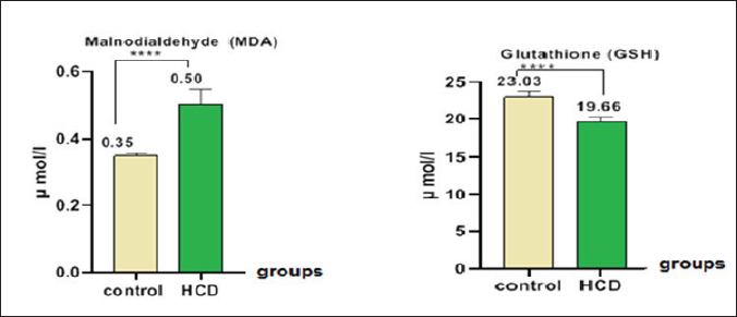 Fig. 1. Malnodialdehyde and GPx concentrations in male rats after hypercholesteremic diet, rats in control group were fed normal diets daily for eight weeks, while rats in hypercholesteremic-diet (0.2 mg/kg BW cholesterol) were fed normal diets daily for eight weeks.