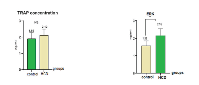 Fig. 2. TRAP and ERK concentrations in male rats after hypercholesteremic diet; TRAP concentration in ng/ml; ERK concentration in ng/ml; rats in control group were fed normal diets daily for eight weeks, while rats in hypercholesteremicdiet (0.2 mg/kg BW cholesterol) were fed normal diets daily for eight weeks.