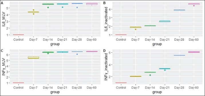 Fig. 1. Fold change (FC) of mRNA expression of IL-6 and INF-γ in MLV and inactivated vaccinated groups at each examination point compared with control animals. (A) FC of IL-6 in the MLV vaccine group. (B) FC of IL-6 in the inactivated vaccine group. (C) FC of INF-γ in the MLV vaccine group. (D) FC of INF-γ in the inactivated vaccine group. Table 2. Gene expression profiles of IL-6 and INF-γ in MLV and killed vaccinated groups compared with control animals (fold change ± SD).