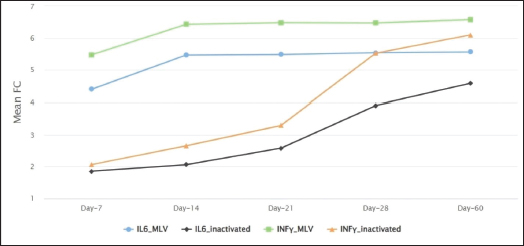 Fig. 2. Comparison of the mean fold change of IL-6 and INF-γ between MLV and inactivated vaccinated groups at each examination point. Our findings agreed with those of Platt et al. (2006), who evaluated the CMI against pentavalent- MLV vaccines containing (BoAHV-1, BVD type-1, BVD type-2, BRSV, and BPIV3). They found that the mean of expressed INF-γ from peripheral blood mononuclear cells was highly significant in the vaccinated group compared to the control group from 4 to 8 weeks after vaccination. Moreover, Van Anne et al. (2018) conducted an experimental study to evaluate the cellular immunity in vaccinated calves using a multivalent killed adjuvant vaccine for five viruses. They found that the average concentration of extracellular INF-γ in the vaccinated group was not different from that of the control group until day 28. However, it was significantly increased in the vaccinated group after 28th day till the end of the study. Our results are consistent with those of Woolum et al. (2003), who found a significant increase in INF-γ production in vaccinated calves with the MLV Bovi Shield vaccine compared to the control group. Moreover, Kornuta et al. (2022) and Zhang et al. (2024) reported a significant increase in the production of INF-γ, IL-4, and TNF-α after immunization with inactivated and MLV vaccines against BoAHV-1, respectively. On the other hand, our findings did not agree with those of Aganja et al. (2021), who reported a down regulation in IL-6 gene expression after vaccination with an inactivated vaccine (Barvac Elite 4SH), and no significant difference in INF-γ expression was observed between the control and vaccinated groups. This difference may be due to the sampling time, as they measured cytokine levels on the 14th day after vaccination. Palomares et al. (2021) conducted a study on the effect of an MLV Bovi Shield Gold vaccine on the expression levels of INF-γ or IL-10. They found that there was no significant change in the expression levels of these cytokines after administering the vaccine. Similarly, Kerkhofs et al. (2004) investigated the gamma-interferon response after using two different vaccines. The first vaccine contained inactivated BRSV and BPIV3, while the second contained MLV BRSV and BVDV. They reported that administering both vaccines did not result in a significant change in the INF-γ response. Throughout the study, the mean fold change of IL-6 and INF-γ was significantly higher in the group vaccinated with MLV than in the inactivated vaccine group. This is consistent with previous studies that have also reported the superior effectiveness of MLV vaccines in inducing cellular immunity (Endsley et al., 2002). Despite the rapprochement of the mean expression level of IL-6 and INF-γ between both groups by the end of the experiment, the statistical difference was still significant. This could be attributed to the small number of animals in each group. Thus, further studies on larger animal samples and for longer periods are needed to confirm these findings. According to a study conducted by Reber et al. (2006), MLV and inactivated BVDV were tested to evaluate their impact on cellular immunity stimulation. Three different vaccination protocols containing MLV BoAHV-1/BPIV3 viruses were used, but the results contradict our findings. The study found no significant change in INF-γ, IL-12, and IL-4 mRNA production between the control and all vaccinated groups. This could be attributed to the vaccines’ inability to stimulate the production of an adequate number of T-helper type 1 cells, as suggested by Charleston et al. (2002). ConclusionBased on our investigation, we have found that both vaccines under study are effective in stimulating CMI through the production of IL-6 and INF-γ. The results indicate that the MLV vaccine (cattle master gold) is superior in stimulating CMI from the first week of the experiment. However, further studies are necessary to fully demonstrate the safety aspects, such as the latency and shedding of BoAHV-1. Moreover, further studies are recommended for in vitro assessment of cytokines release following peripheral blood mononuclear cells restimulation by vaccine strains. By better understanding the impact of these vaccines on the immune system, we can develop more effective strategies for preventing and treating this common and costly disease. AcknowledgmentThe authors are grateful to the animal owners of the private dairy farm in Gharbia Governorate, Egypt for subjecting their animals to the study. Conflict of interestThe authors declare that there is no conflict of interest. Authors’ contributionsConceptualization, MIE, NZA, MFE, and MIA; methodology, MEE, and MIA. SGY carried out the statistical analysis and interpreted the results. SGY and EMB wrote the first draft of the manuscript. MIE, NZA, MFE, and MIA revised and edited the initial manuscript. All authors contributed to the article and approved the submitted version. FundingThis research received no external funding. Data availabilityAll data findings during our investigation are available within the manuscript. ReferencesAganja, R., Seo, K., Ha, S., Yi, Y. and Lee, S. 2021. Evaluation of immune responses in dairy cows immunized with an inactivated vaccine for bovine respiratory disease. Korean J. Agric. Sci. 48, 251–264. Centeno-Martinez, R.E., Glidden, N., Mohan, S., Davidson, J.L., Fernández-Juricic, E., Boerman, J.P., Schoonmaker, J., Pillai, D., Koziol, J., Ault, A., Verma, M. and Johnson, T. 2022. Identification of bovine respiratory disease through the nasal microbiome. Anim. Microbiome. 4(1), 15. Charleston, B., Brackenbury, L.S., Carr, B.V., Fray, M.D., Hope, J.C., Howard. C.J. and Morison, W.I. 2002. Alpha/beta and gamma interferons are induced by infection with noncytopathic bovine viral diarrhea virus in vivo. J. Virol. 76, 923–927. Endsley, J.J., Quade, M.J., Terhaar, B. and Roth, J.A. 2002. BHV-1-Specific CD4+, CD8+, and gammadelta T cells 