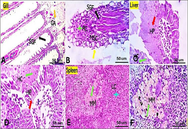 Fig. 3. Gills, Liver, and Spleen of Saffron (Crocus sativus) prophylaxis dose ( 1.5, 0.5 /Kg BW), respectively, in gills showing normal secondary filament structures in A partial adhesion of the secondary filaments are seen in (SGF, black arrow) in D. In liver the pancreatic cells (P) and afferent blood arteries, have been found to be attached to the liver. Mildly dilated lymphatics (DL, brown star) at the vicinity of the hepato-portal (HP) area and the hepatic cells (HC) in B and E. Spleen showing ill-distinctly distributed lymphoid elements (LC, light blue stars) around splenic sinusoids (SS, red star). The melano-macrophage centers (MMC,green arrow) are mildly activated, in C and F.