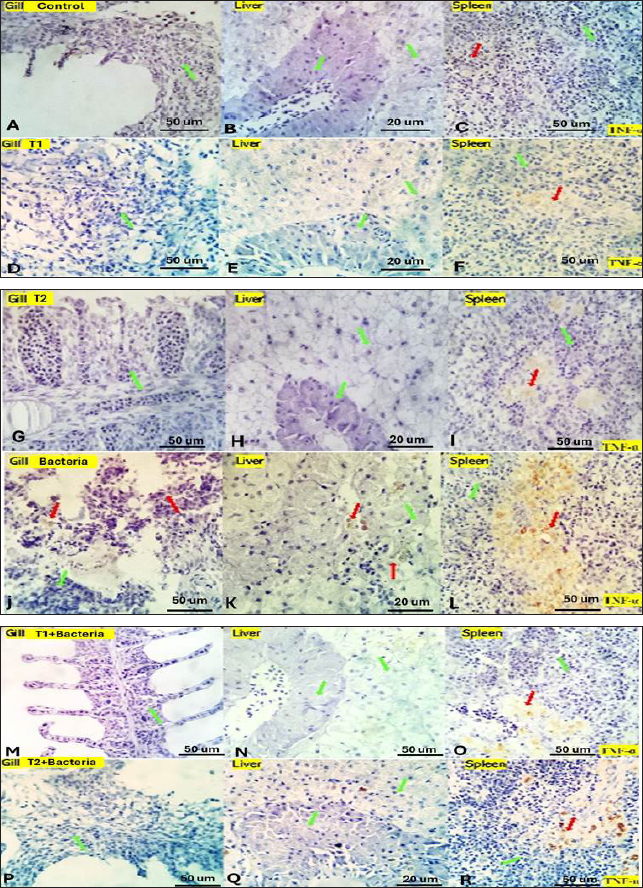 Fig. 6. Gills, liver and spleen of different experimental groups, immune-stained by TNF-α, showing the positively reacted inflammatory cells (red arrows) and the negatively stained cells (green arrows).