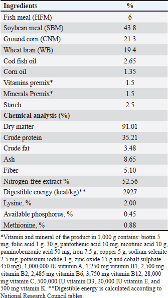 Table 1. Dietary content and proximate formulation of the Nile tilapia (Oreochromis nuloticus) basal diet.