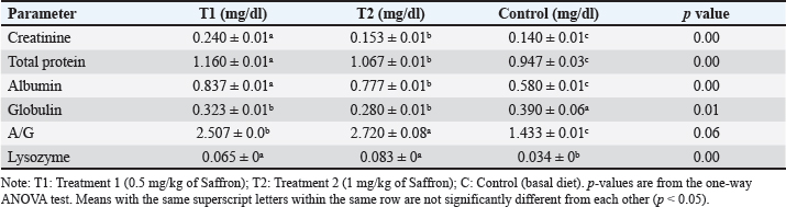Biochemical blood parameters After 12 weeks, blood samples were taken from the caudal vessels of fish (five per replicate, 15 fish/treatment), with no anticoagulant. The blood was allowed to clot at room temperature for 2 hours before being centrifuged at 1,400 × g for ten minutes to extract serum, which was stored at −20°C until it was needed for further biochemical and immunological analysis. The total serum protein and albumin were determined according to (Chen et al., 2016), respectively. Globulin was calculated by subtracting albumin level from total protein, while serum creatinine was measured colorimetrically. Challenge test The isolation of Aeromonas species was done before the challenge, the strain was isolated from diseased Nile tilapia that suffered a normal hemorrhagic septicemia outbreak. A sample was collected from the surface and intestinal tract of fish under sterile conditions and squeezed into a sterile Eppendorf tube, which was then taken immediately for examination using the plate counting technique. The culture was selected and regularly cultured for 24 hours at 37°C on tryptic soy broth (Oxoid). After the bacterial colonies were purified, the morphology of the bacteria was determined by microscopic analysis of the cells and determination of the Gram type. Following the feeding trial, each treatment group was pooled and challenged by injection intraperitoneally with A. hydrophila at a dose of 0.1 ml of 24-hour broth containing 5 × 105 CFU/ml. A control group received 0.1 ml saline via intraperitoneal injection. Mortality and clinical signs Ten days post-injection mortality was recorded daily. The fish were also monitored for clinical signs of disease, such as loss of appetite, lethargy, skin lesions, and finally postmortem lesions. Then, survival %=100 × (final fish number/initial fish number) calculated according to Alandiyjany et al. (2022). Immunoglobulin Serum immunoglobulin M (IgM) levels were measured using an Enzyme-Linked Immunosorbent Assay (ELISA) kit and ELISA reader rt-2100c, MyBioSource.Com. Serum lysozyme activity Lysozyme activity was determined using the turbidometric assay (Biller et al., 2021). The units of lysozyme present in plasma or mucus (μg/ml) were obtained from a standard curve made with lyophilized hen-egg-white-lysozyme (Sigma). Histopathology After saffron treatment and 7 days post-challenge fishes were anesthetized by using a 0.1 ppm solution of ethyl 3-aminobenzoate methanesulfonate (Sigma-Aldrich Chemie GmbH, Eschenstrasse, product No. E10521, Germany), then fishes were necropsied, and the liver, kidneys, gills, and spleen were removed. The tissues were fixed in 10% formalin and processed for histopathology Specimens were then immediately processed to obtain 4 μm paraffin section cut from both sagittal and transverse planes. Sections were stained with Hematoxylin and Eosin stain for microscopic examination. Immunohistochemistry The immunohistochemistry analysis was carried out using standard procedures (Vannucchi, 2022). The 5 µm-thick paraffin sections were deparaffinized in Xylene and rehydrated by immersing the slides through alcohol grades step, then antigen retrieval done using a microwave and bring all slides to a boil in 10 mM sodium citrate buffer (pH 6.0), then tissue sections immersed in 3.0% hydrogen peroxide in methanol for 15 minutes, to block endogenous peroxidase activity, then the primary antibody (TNFα, NBP1-19532, dilution: 1/250) and (CD68, NB100-683, dilution: 1/1000) from Novus Biologicals (Littleton, CO, USA) incubated at room temperature for 1–2 hours. Continued the incubation overnight at 4°C in a humidified chamber. For detection, 100–400 ul Streptavidin-horseradish peroxidase reagent was added to each section and incubated for 30 minutes at room temperature, followed by 100–400 ul 3,3′-diaminobenzidine tetrahydrochloride substrate was used as chromogen, then counterstained sections in hematoxylin, dehydrated and mounted. The study used an Olympus digital camera and microscope to digitize image analysis slides of both TNFα and CD68 positive expression. The images were analyzed using Video Test Morphology 5.2 software on an Intel® Core I3®-based computer. The system measured the area percentage of Caspase-3 positive expression. Statistical analysis Data were statistically analyzed using the SPSS software version 23. A one-way ANOVA test was performed for comparison between different treatments, and a two-way ANOVA test was performed for comparison between different treatments, different times, and their interaction. Duncan's multiple ranges test was used for comparisons between means of groups. The means followed by the same letter were not significantly different from each other at the 5% probability level (p-value at 0.05). Ethical approval All experimental techniques were carried out according to the guidelines and suggestions approved by the Institutional Animal Care and Use Committee (IACUC), Faculty of Science, Zagazig University, Egypt, using the reference number (ZU-IACUC/1/F/407/2022). ResultsGrowth performance and feed efficiencyThe effects of saffron supplementation on the growth performance of Nile tilapia (Oreochromis niloticus) are presented in (Table 2). Fish supplemented with 1.5 g/kg saffron (Group T1) showed significantly (p < 0.05) higher average weight gain (AWG) compared to the control and 0.5 g/kg saffron treated group (82.64 g, 63.73 g, and 54.53 g, respectively). Moreover, the 1.5 g/kg saffron (Group T1) groups showed the greatest improvement (p < 0.05) in FCR, protein efficiency ratio (PER), and SGR than the control and 0.5 g/kg saffron treated group (Group T2). The control group showed the lowest growth performance parameters (AWG, SGR, FCR, and FER). Biochemical blood parametersThe effects of Saffron supplementation on biochemical parameters in Nile tilapia are shown in (Table 3). In terms of creatinine levels, the T1 and T2 groups showed significantly higher lev