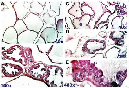 Fig. 3. Control positive group. Section of prostate shows benign prostatic hyperplasia. There are PGs, thickening of the FMS, and obliterated LU. H&E stain, (A) and (B) 40X. (C) 100X. (D) and (E) 400X.