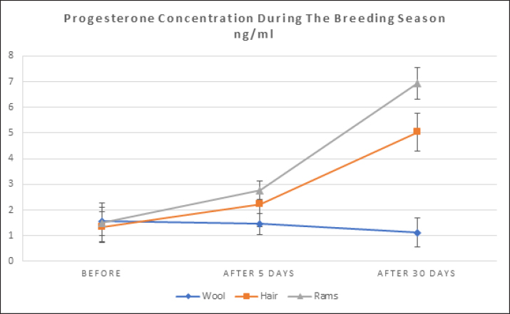 Fig. 2. Shows the rates of increase in P4 among the experimental groups during the breeding season. Numerous releaser pheromones have been identified in mammals (Schaal et al., 2003). For sheep and goats, exposure to male odors can transition females from a seasonally non-reproductive endocrine state to a reproductive one (Martin et al., 1986; Chemineau, 1987). This phenomenon, commonly referred to as the “male effect”, is a notable instance of primer pheromone influence in mammals (Delgadillo et al., 2011; Murata et al., 2009). The ram effect is primarily linked to olfactory signals, presumably pheromones, produced by the male (Claus et al., 2001). Murata discovered a scent molecule that stimulates the GnRH pulse generator, a crucial reproductive regulator in goats (Murata et al., 2014). Through gas chromatography-mass spectrometry analysis of volatile substances from male goats, they identified various ethyl-branched aldehydes and ketones. Their research electro-physiologically verified that 4-ethyloctanal, one of these substances, activates the GnRH pulse generator in female goats. This compound is also a vital component of the male goat scent, significantly influencing female attraction. Moreover, when 4-ethyloctanal undergoes oxidation, it converts into 4-ethyloctanoic acid, the primary component responsible for the distinctive goaty aroma (Murata et al., 2014). It is noteworthy that the chemical compounds 4-methyl octanoic acid and 4-ethyl octanoic acid, present in the pheromones emitted by male goats and sheep, exhibit a significant similarity. These compounds, found in varying ratios, are believed to contribute to the “male effect”. This similarity provides an explanation for the findings reported by (Claus et al., 2001). Our findings on the impact of pheromones contrast with a study that reported no changes in LH or FSH secretion (Schneider and Rehbock, 2003). However, other studies have found that pheromone use led to ovulation (Kaulfulb et al., 1997, 2002) or increased pregnancy rates in inseminated ewes. It has also been observed that full contact is not necessary for a response between ewes and rams (Watson and Radford, 1960) and that the scent of wool and wax from healthy rams is sufficient to elicit an ovulation response in ewes (Knight and Lynch,1980). Morgan noted that ewes with a weak scent did not respond to rams (Morgan et al., 1972), but a normal LH response was observed in ewes reported as lacking olfactory activity (Cohen-Tannoudji et al., 1989). Researchers have indicated that both wool and wax are the primary sources of pheromones that contribute to the ram effect (Knight and Lynch, 1980), and that pheromones produced by males can also induce pulsed frequency secretion of LH (Over et al., 1990) and ovulation in diestrus ewes (Knight et al., 1983). Pheromones have been found in aqueous extracts of wool and wax (Knight and Lynch, 1980), and are produced by the skin, particularly around the eyes (Martin, 2001). The concentration of extracted pheromones, the extraction method, and their application to animals can contribute to the variation in results between studies. However, we can say the male effect enhances reproductive efficiency in female sheep and goats by transitioning them from a non-reproductive to a reproductive state through male pheromones. The scent of wool and wax from healthy rams can trigger ovulation even without direct contact. Pheromones from wool, wax, and skin, especially around the eyes, play a crucial role in this process, making it a natural, efficient, and effective method for improving reproductive outcomes in livestock. ConclusionExposing female sheep and goats to sexually active males during estrus periods significantly increases LH secretion, which is crucial for ovulation. This response includes both immediate and sustained increases in LH pulses. The "male effect," driven by male pheromones, transitions females from a non-reproductive to a reproductive state. Pheromones from wool and wax are primary contributors to this effect, and full contact between ewes and rams is not necessary for a response. However, variations in results between studies may be due to differences in pheromone concentration, extraction methods, and application techniques. AcknowledgmentsNone. Conflict of interestThe authors declare that there is no conflict of interest. FundingACSAD (Arab Center for Studies of Arid and Dry Lands) is considered the primary supporter in conducting the research, as the experiment was implemented on its farms, while the Atomic Energy Commission provided the laboratories in which the hormonal analyzes were conducted and (GCMS) device was used, and the Oniris Institute in France provided Hormonal Kits, and pheromone extraction was performed at the Faculty of Science at the University of Damascus in Syria. The University of Hama in Syria also partially contributed to the financial costs. Authors’ contributionsHassan Harba is the primary researcher, implementer, and writer of the research, as this research is part of the doctoral thesis that is currently being prepared. Dr. Mohamad Moussa supervises the research as a scientific supervisor and assistant in directing and writing the thesis, and Dr. Abdel Moneim AlYasin is the assistant practical supervisor during the implementation of the research in the ACSAD organization. Dr. Moataz Zarkawi is the co-supervisor from the Atomic Energy Commission, where he helped conduct tests and analyzes related to the research plan, and Dr. Lamia Briand Amirat played a role in securing hormonal analysis kits and helping to direct and revise some aspects of the thesis. Data availabilityAll data are provided in the manuscript. ReferencesAlvarez, L., Ramos, A.L. and Zarco, L. 2009. The ovulatory and LH responses to the male effect in dominant and subordinate goats. Small. Rumin. Res. 83, 29–33. Avdi, M., Leboeuf, B. and Terqui, M. 2004. Advanced breeding and “buck effect” in indigenous Gre