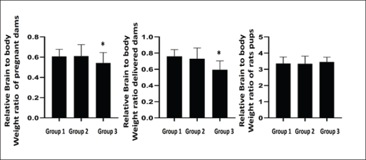 Fig. 3. The depicted figure represented relative brain to body weight ratio of pregnant dams, delivered rats and rat pups.