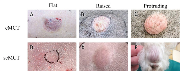In comparing the two classified groups, we assessed the maximum tumor diameter, gross findings in the photographs, and histological findings. Grossly, tumor elevation from the skin surface was classified into three degrees: 1 (flat), 2 (raised), and 3 (protruding) (Fig. 1). Additionally, we recorded the presence or absence of hair loss, color change, and ulceration on the tumor surface. Histologically, our focus was on the changes in the epidermis and adnexa, and the histological grade (Patnaik’s classification for cMCT, Kiupel’s classification for both cMCT and scMCT) (Patnaik et al., 1984, Kiupel et al., 2011). Loss of hair follicles was classified as follows: 1 (absent), 2 (mild, loss area <25%), 3 (intermediate, loss area 25%–75%), and 4 (severe, loss area >75%).