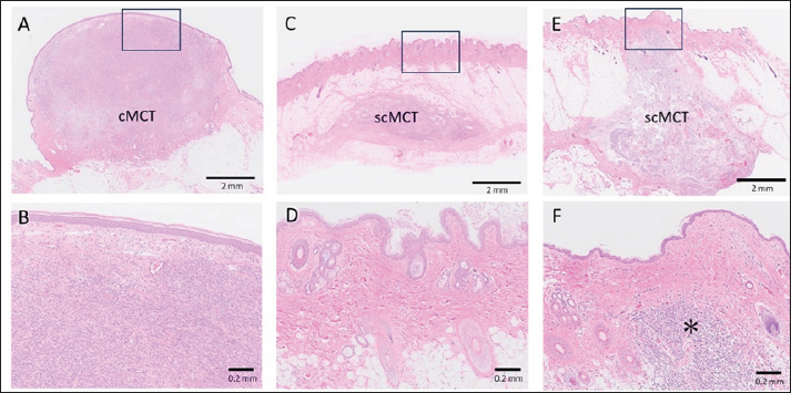 Fig. 2. Histological pictures of cMCT (A, B) and scMCT (C–F) (HE stain). (A) Typical lesion of cMCT located in the dermis. (B) Higher magnification of box in A, showing loss of hair follicles due to MCT infiltration. (C) Typical lesion of scMCT located in the subcutis. (D) Higher magnification of box in C, showing normal structure of adnexa. (E) Lesion of scMCT partially attached to the dermis. (F) Higher magnification of box in E. Hair follicles are absent only in the area of tumor infiltration (asterisk).