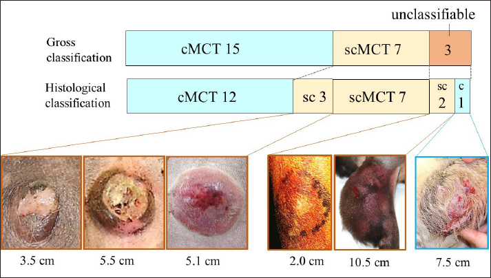 Methods: Gross photographic and histologic features of 52 MCTs (2014–2022) were retrospectively compared between cMCTs and scMCTs. Based on these results, we grossly classified an additional 25 MCTs (2007–2013) into two forms using photographic observations. These observations were then compared with the results of histological classification performed by a blinded pathologist.