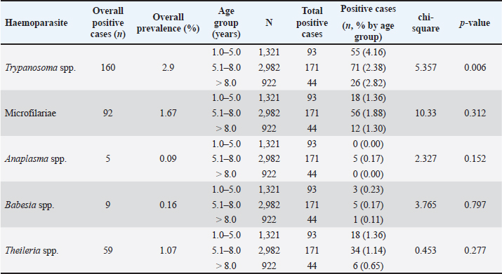 AbstractBackground: Hemoparasitic infections significantly threaten cattle health globally, leading to economic losses and welfare issues for farmers. Aim: This retrospective study aimed to investigate the prevalence and associated factors of hemoparasitic infections in fighting bulls in southern Thailand over an 8-year period. Methods: Laboratory records of 5,518 bulls from the Livestock Animal Hospital, Faculty of Veterinary Science, Rajamangala University of Technology Srivijaya, were reviewed for the period January 2016 to December 2023. Blood samples were analyzed using thin blood smear methods to identify hemoparasites, and packed cell volume was measured using the microhematocrit method. Detailed profiles and demographic data for each animal were recorded. Results: Among the fighting bulls, 323 (5.85%) tested positive for hemoparasitic infections, with five hemoparasites identified: Trypanosoma spp. (TP), Microfilariae, Anaplasma spp. (AP), Babesia spp. (BB), and Theileria spp. (TR). TP was the most prevalent at 2.90%. Bulls aged 1–5 years showed the highest infection rates at 7.04%, with a decline in infections as age increased. Annual trends peaked in 2018 at 8.80%, with significant yearly fluctuations for most parasites (p < 0.05) except AP and BB. Monthly analyses revealed the highest infection rates in March, particularly for TP, with significant monthly variations for TR (p < 0.05). Geographical differences in infection rates between the East and West coasts were minor and not statistically significant. However, seasonal variations were significant for BB and TR on the east coast during summer (p < 0.05). Bulls with PCV below 30% had a higher prevalence of hemoparasitic infections (8.06%) compared to those with PCV above 30% (5.87%), with significant differences in the prevalence of AP and TR infections (p < 0.05). Conclusion: This study adds to the understanding of hemoparasite infections in bulls, informing the development of educational materials for farmers and ultimately empowering them to make better herd health decisions. Keywords: Blood parasite, Prevalence, Indigenous cattle, Bull, Epidemiological factors. IntroductionHemoparasitic infections in cattle are critically important due to their significant impact on livestock health, productivity, and the broader agricultural economy (Heylen et al., 2023). Infections caused by protozoan and rickettsial parasites such as Babesia (BB), Theileria (TR), Anaplasma (AP), and Trypanosoma (TP) species can lead to diseases with varying severity, manifesting as anemia, fever, weight loss, and sometimes death (Tefi et al., 2015; Julie et al., 2021). Morbidity rates for hemoparasitic infections in cattle can be as high as 90%, with mortality rates ranging from 10% to over 50%, influenced by the parasite species, cattle breed, and local conditions (Swai et al., 2009; Khan et al., 2021). These parasites are predominantly transmitted by ticks, with various tick species acting as vectors for different hemoparasites (Yitayew and Samuel, 2015). The economic impact is considerable, encompassing reduced meat and milk production, increased veterinary expenses, and potential trade restrictions (Strydom et al., 2023). The prevalence of hemoparasitic infections in cattle varies widely across regions, especially in tropical areas (Ferraz da Costa et al., 2014; Jirapattharasate et al., 2017; Dharanesha et al., 2017). This variability is influenced by factors such as climate, vector presence, management practices, and host immunity (Maharana et al., 2016; Weny et al., 2017). Fighting bulls, indigenous cattle in southern Thailand, are selected for bullfighting due to their superior physical attributes, including body conformation, skin pigmentation, horn structure, aggressive behavior, and proficient fighting skills. This culturally significant sport has grown in popularity, attracting tourists and boosting local economies (Mhonghong et al., 2019; Chodchaey et al., 2022). Bulls chosen for competitions typically undergo rigorous training and conditioning from the age of 4–5 years, involving daily walks of 5–10 km and monthly sparring sessions to achieve peak physical fitness (Mhonghong et al., 2019; Chodchaey et al., 2022). Given their high value, effective health monitoring and management are crucial for ensuring the robustness and enhancing the fighting capabilities of these bulls. Hemoparasitic infections in beef and dairy cattle in Thailand have been extensively investigated, revealing the presence of various hemoparasites, including BB, TR, and AP, in the central, western, and northern regions of the country. High incidences of these infections are reported in areas with dense cattle populations (Kaewthamasorn and Wongsamee, 2006; Jirapattharasate et al., 2017; Srionrod et al., 2022; Koonyosying et al., 2022). A previous study reported a 42.50% prevalence of hemoparasitic infections in fighting bulls (Keawchana et al., 2021). However, limited knowledge exists on hemoparasitic infections in fighting bulls, particularly regarding their prevalence, temporal patterns, and potential risk factors. This study aimed to address this gap by investigating the prevalence and temporal dynamics of these infections in fighting bulls from southern Thailand over an 8-year period. Additionally, it sought to identify and analyze factors associated with these infections within this unique population, with the aim of improving individual and herd health management practices. Materials and MethodsStudy areaBlood samples were collected from fighting bulls at the Large Animal Hospital (or relevant department) within the Faculty of Veterinary Science, Rajamangala University of Technology Srivijaya (RUTS), Nakhon Si Thammarat campus, located within the latitudinal range of 5°–12° North and longitudes 98°–103° East. These bulls originated from various regions across southern Thailand. The region experiences a tropical monsoon climate with a longer rainy sea