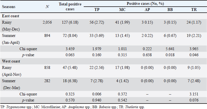 Season-wised hemoparasitic infectionsOur results showed significant variations in the prevalence of BB and TR during different seasons on the East Coast (p < 0.05). BB and TR showed higher infection rates during the summer (0.67% and 2.21%) than in the rainy season (0.15% and 1.17%). On the West Coast, there were no significant seasonal differences in the prevalence of the tested parasites, except for TR, which approached significance with a higher infection rate during the rainy season than in the summer (Table 5). Hemoparasitic infections observed in distinct provincesThe results revealed significant geographical variations in infection rates (Table 6). TP had the highest prevalence in Krabi (3.0%) and the highest number of cases in Nakhon Si Thammarat (2.5%). MC infections were most common in Krabi (1.4%) and Nakhon Si Thammarat (1.6%), with other provinces reporting lower rates. AP was rarely detected, with minimal cases primarily in Nakhon Si Thammarat. BB was found exclusively in Nakhon Si Thammarat and Krabi. TR had sporadic occurrences, mainly in Krabi and Phatthalung (0.9%). Statistical analysis discovered significant variations in the prevalence of TR and BB, but not for MC, AP, and TR in substantial regional differences. Table 5. Seasonal prevalence of hemoparasitic infections on both coastlines (East and West) in southern Thailand, shown as positive cases and percentages.