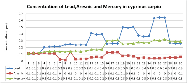 Fig. 6. Concentration of Arsenic, Lead, and Mercury in muscle of C. carpio. This results agree with Carlos et al. (2020) who found that heavy metal concentrations (Hg, Pb, Cu, As, Cd, and Zn) in fish muscle of (Mugil incilis, Cathorops mapale, Eugerres plumieri, Centropomus undecimalis, and Elops smithi) were low compared to the maximum levels for fish consumption set by national and international monitoring organizations, while disagree with Robeena et al. (2019) who found that bioaccumulation of heavy metal (As), Cadmium (Cd), Iron (Fe), and (Pb) in Channa punctatus in Ramganga river in India has surpassed the levels that are safe for human consumption.