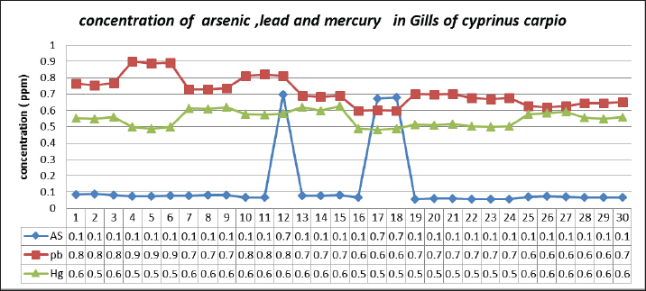 Fig. 4. Concentration of Arsenic, Lead, and Mercury in liver of C. carpio. Table 3. Heavy metals concentration in gill of C. carpio (ppm). Values are expressed as mean ± SE.
