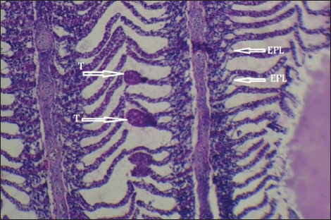 Fig. 7. Histopathological sections of gill of C. carpio showing telangictatisis (T) and epithelial lifting (EPL) (H&E X10).