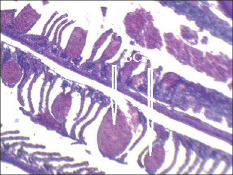 Fig. 8. Histopathological sections of gill of C. carpio showing severe telangiectasia in secondary lamellae with hemorrhage and blood congestion (BC) (H&E X10). Pb has detrimental effects on both human health and the environment. Pb’s toxicity varies according to its concentration, oxidation state, and chemical composition (Khan et al., 2016). According to Gercia-Leston et al. (2010), lead has a number of harmful health effects, including neurotoxicity and nephrotoxicity. The current study’s findings showed that Pb was detected in C. carpio liver, gill, and muscle samples that were taken from the local Baqubah markets. Furthermore, the bioaccumulation of Pb in these samples had fallen below the WHO’s (1990) permitted limits for human consumption, which are 1.5 ppm. These results are also observed by Zarith and Mohd (2015) who found that the heavy metals concentrations of (Zn, Cu, Ni, Pb, Cd, and Mn) in water samples and six species of freshwater fish (Barbonymus schwanenfeldii, Hampala microlepidota, Hemibagrus nemurus, Mystacoleucus marginatus, Oreochromis niloticus, and Cyclocheilicthys apogon) collected from Galas River and pool of Beranang mining were lower than the permissible limit set by Malaysian Food Regulations 1983 and Food Act 2003 and agree with Carlos et al. (2020). While disagree with Alsarraj et al. (2014) who studied the concentration of lead and cadmium metals in the organs and tissues of different fish species in Tigris river near the city of Mosul, the highest value of lead was in the gills of C. carpio and it was 4.01 ± 8.78 μg/g which was higher than the permissible limit of WHO and disagree with Robeena et al. (2019).