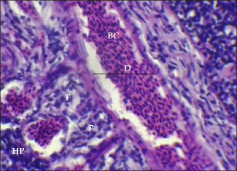 Fig. 9. Histopathological sections of gill of C. carpio showing central venous dilation (D) with blood congestion (BC), epithelium hyperplasia (HP) with complete fusion of the secondary lamellae (F) (H&E X40).