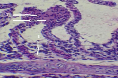 Fig. 11. Histopathological sections of gill of C. carpio showing edema in the filamentary epithelium (E) (H&E X40).