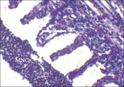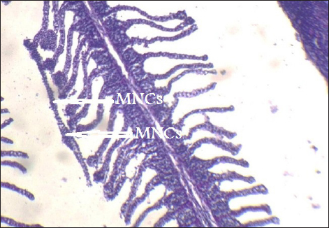 Fig. 13. Histopathological sections of gill of C. carpio showing Mononuclear cells infiltration (MNCS) (H&E X40).