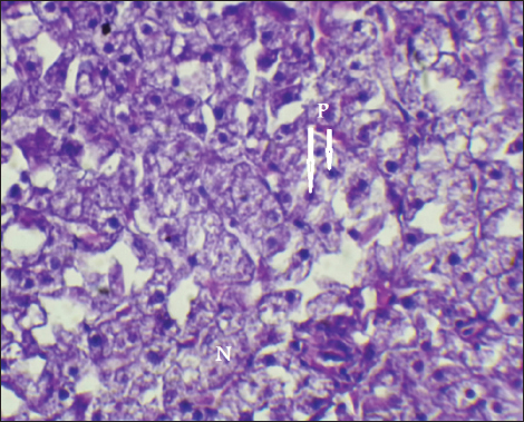 Fig. 14. Histopathological sections of liver of C. carpio showing necrosis(N) and Pyknosis (P) (H&E X40). This study showed that C. carpio contains different concentrations of the selected heavy metals in the liver, gill, and muscle, the causes of this differences is due to the collection of samples at different intervals and, therefore, the level of contamination in water and food and sediment varies depending on the time period also differences in fish’s internal uptake and water temperature. Kalay et al. (1999) revealed that the amounts of minerals that different fish species accumulate in their tissues vary noticeably. Furthermore, Canli and Atli (2003) revealed that heavy metals levels in fish vary between species and different aquatic environments. Conversely, Farkas et al. (2000) linked variations in mineral concentrations among fish to their feeding habits, the ability of each species to bioconcentrate, and the mineral’s biochemical characteristics. Roméo et al. (1999) also state that the environment, metabolism, needs, level of contamination in water, sediment, and food, as well as water temperature and salinity, all affect a fish’s ability to accumulate heavy metals. Also, Brraich and Kaur (2017) revealed that the levels of heavy metals in different fish organs are directly impacted by the contaminating of the aquatic environment and by the fish’s internal uptake, control, and removal of heavy metals.