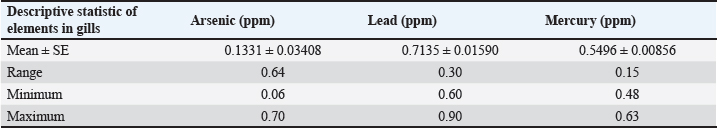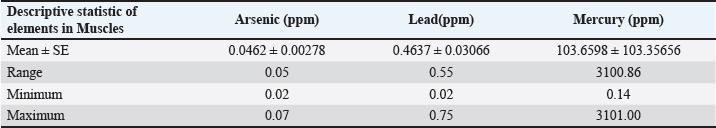Table 6. Mean ± SE, range, minimum, and maximum value of heavy metal content in muscle samples of C. carpio.
