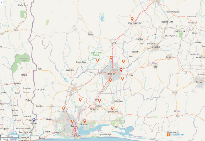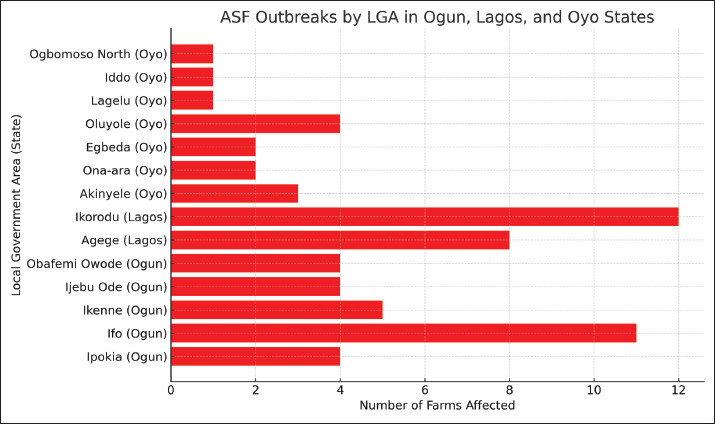 Epidemiological investigations across 62 pig farms (Figs. 1, 5, and 6) indicated that the index case emerged in December 2019 at a farm in Ipokia Local Government Area (LGA), Ogun State. This was followed by two confirmed cases within the same locality in January 2020. Later that same month, an additional outbreak was reported in Ifo LGA, located approximately 75 km from Ipokia. By March 2020, confirmed cases had extended to Agege LGA in Lagos State (approximately 74.5 km from Ipokia and 30 km from Ifo), as well as Ona-Ara LGA in Oyo State (approximately 211.5 km from Ipokia and 152 km from Ifo).