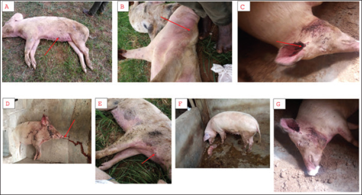 Fig. 4. Clinical signs of ASF in pigs in Southwest Nigeria. A: Cyanosis and purplish skin discoloration B: Hyperemia of the dermis. C and D: Hemorrhagic discharge from the nostrils and external ear canal. E: Petechial hemorrhages on the skin surface. F: Abortion in a pregnant sow, indicative of acute ASF. G: Acute respiratory distress with foamy oral exudate, culminating in death. Table 8. Clinical findings on some pigs affected by ASF in southwest Nigeria (2019–2021).