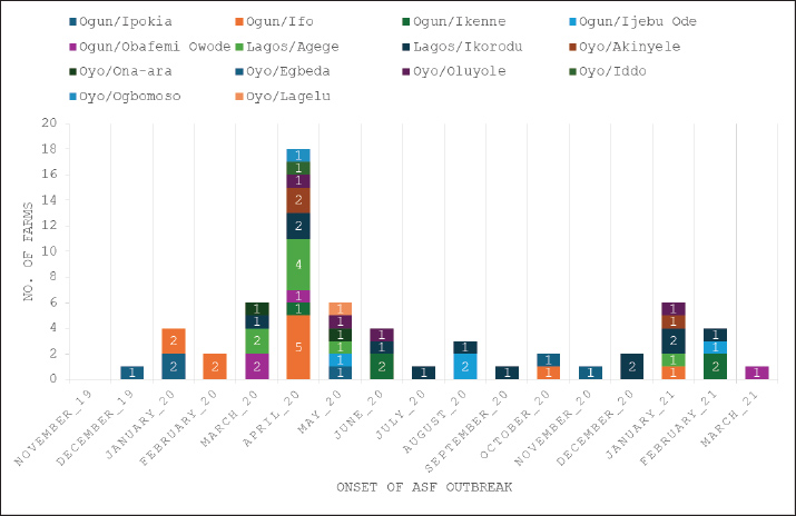 Fig. 5. Epidemiological curve illustrating the temporal spread of ASF across 62 pig farms located in 14 LGAs within Southwest Nigeria, spanning December 2019 to March 2021.