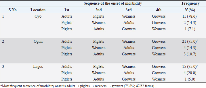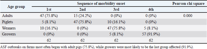 Morbidity patterns, mortality rate, and reduction in farm sizeRegarding morbidity patterns, the most reported sequence of onset across pig age groups was adults → piglets → weaners → growers (75.8%) (Table 3). A statistically significant association was observed between age and morbidity onset during ASF outbreaks (p=0.000). The likelihood of initial morbidity in adult pigs was 75.8% while growers were the most frequently the last group to exhibit clinical signs, with a probability of 91.9% (Table 4). Table 3. Sequence of onset of morbidity across age groups of pigs during ASF outbreak