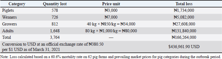 Table 6. Financial loss due to ASF outbreak in Oyo, Ogun, and Lagos states, Southwest Nigeria (December 2019–March 2021).